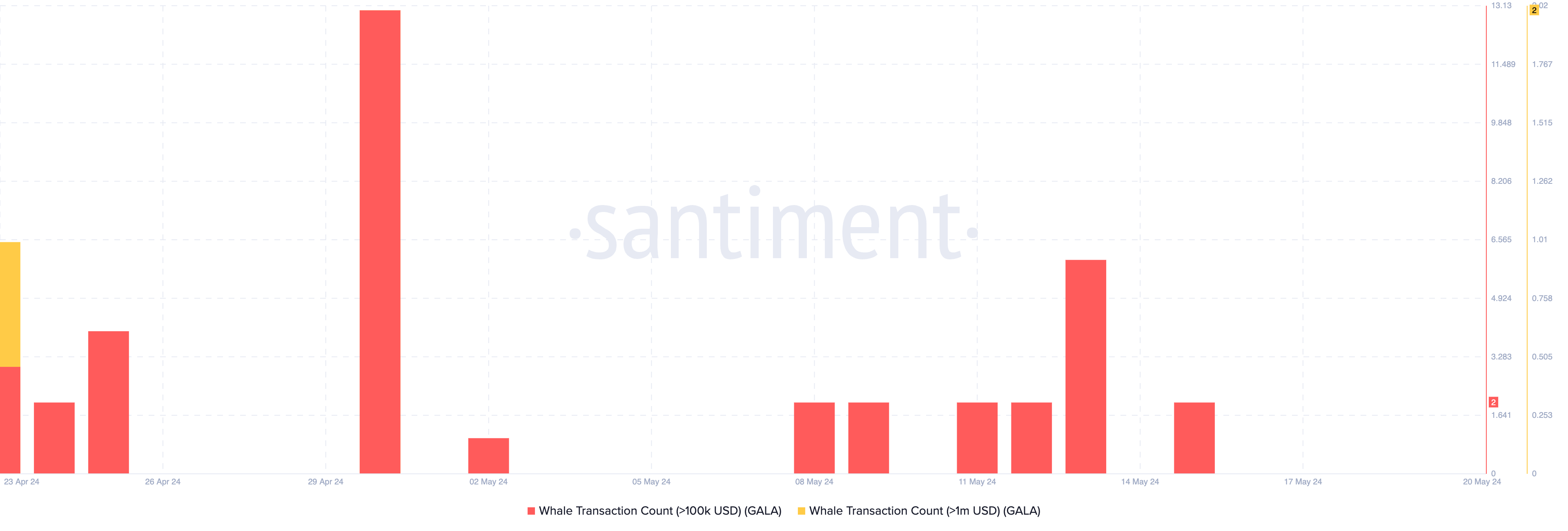 トークンのクジラ活動の評価はこれを確認した。5月16日以降、市場では10万ドルまたは100万ドルを超えるGALA取引の重要なカウントは見られていない。