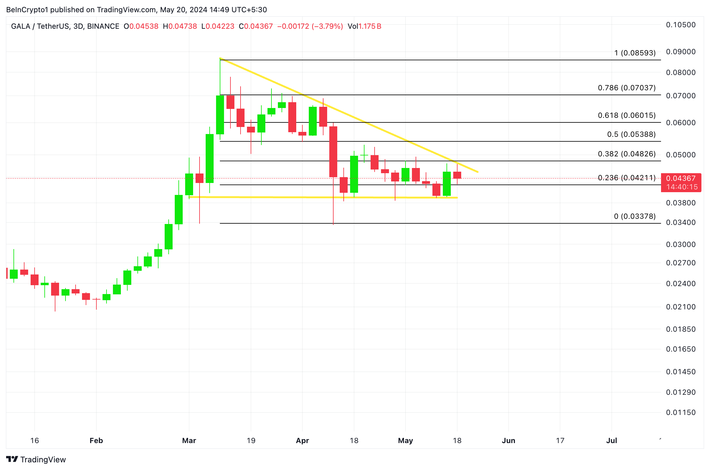 GALAは現在0.0437ドルで取引されている。その価値は先週5%近く上昇し、0.03ドルの長期的なサポートレベルの上で取引されている。