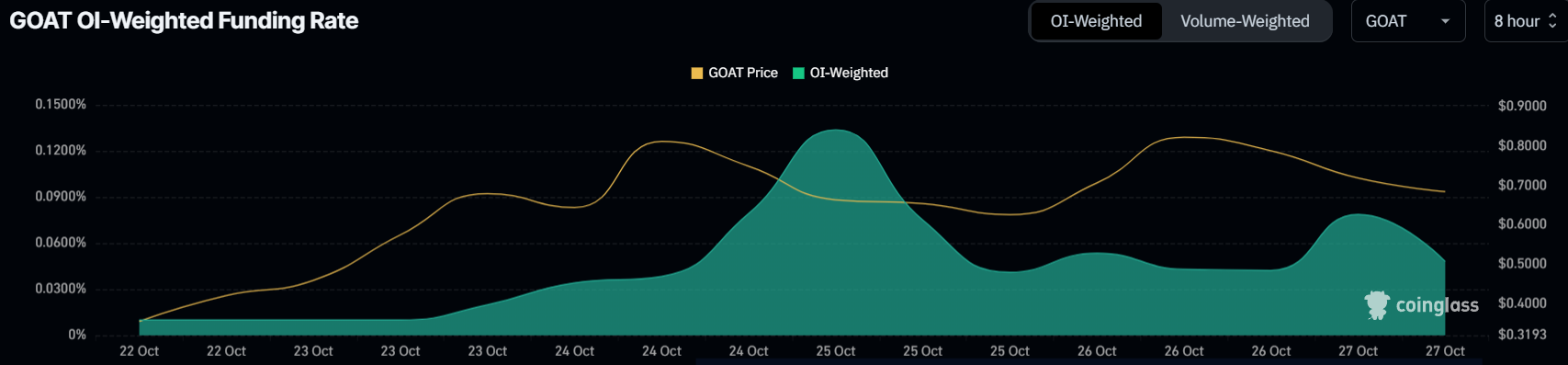 GOATのマクロな勢いも弱まりの兆しを見せており、主にコインのファンディングレートに反映されています。ファンディングレートは依然としてプラスですが、徐々に低下しており、一部のトレーダーがショート契約を開始していることを示しています。オープンインタレスト(OI)の増加とファンディングレートの低下は、トレーダーが価格の下落を予測し始めていることを示唆しています。