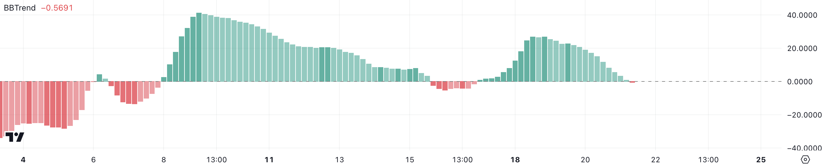 BBTrendはボリンジャーバンドを使用して価格トレンドの強さと方向を測定し、プラスの値は上昇トレンドを示し、マイナスの値は下降トレンドを示す。マイナスのBBTrendは下方圧力の増加を反映し、市場全体のシフトの始まりを示す可能性がある。