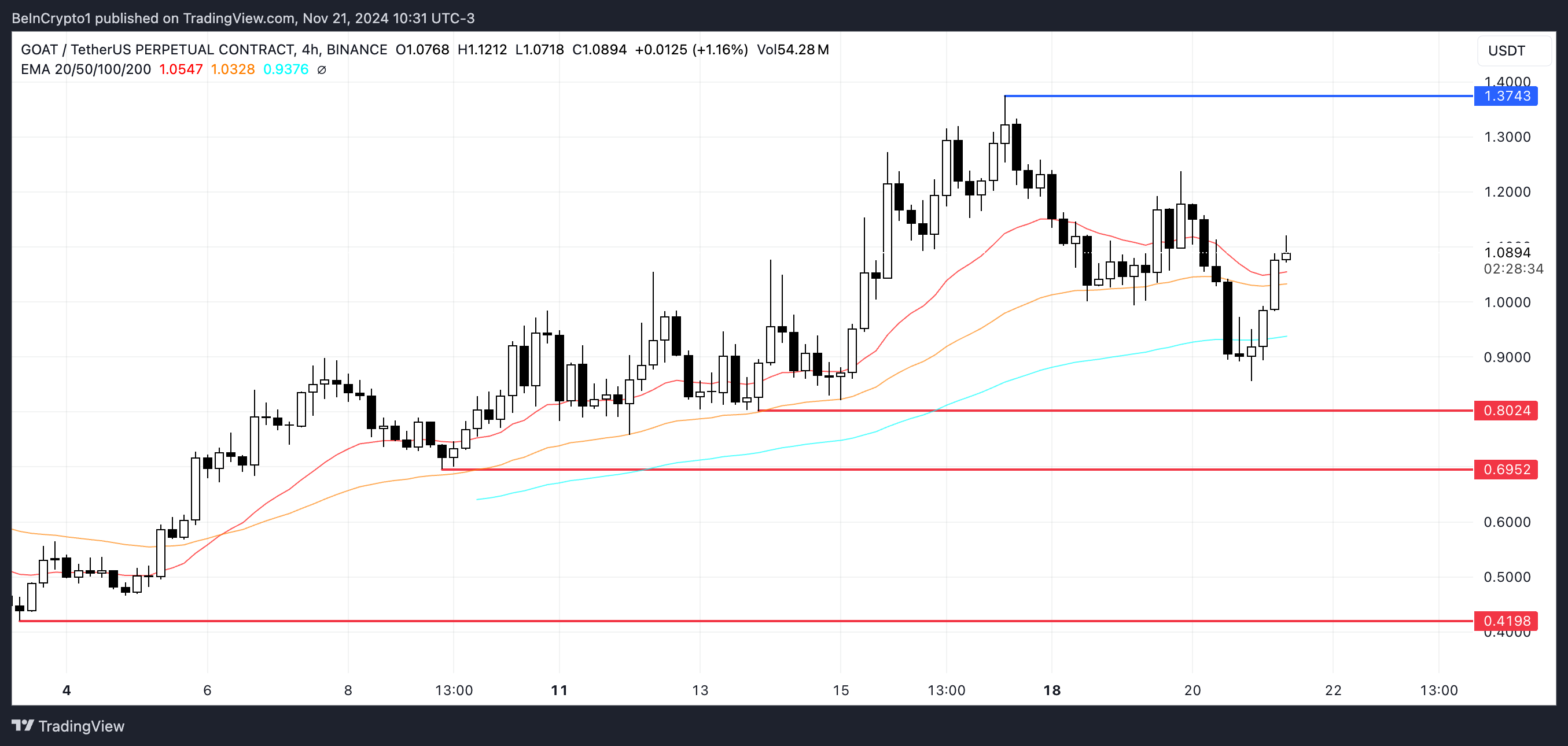 しかし、RSIやBBTrendのような指標が示すように、上昇トレンドは勢いを失っている可能性がある。下降トレンドが出現した場合、GOATの価格は0.80ドルや0.69ドルの最も近いサポートゾーンをテストする可能性がある。
