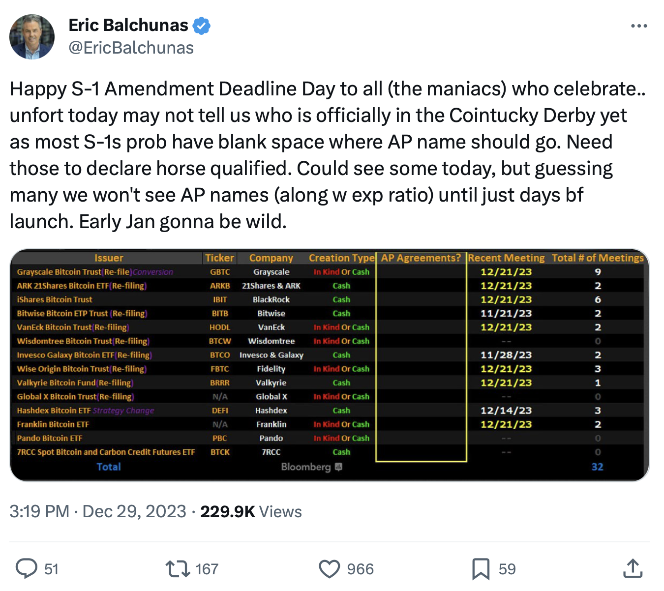 申請者は2023年12月29日までにSECへのS-1提出書類を修正しなければならなかった。BloombergのETFアナリストであるEric Balchunas氏は、多くの企業はARKの期限間近にETF株式を作成し、償還することができる認可されたエンティティのみをリストアップするだろうと予測している。