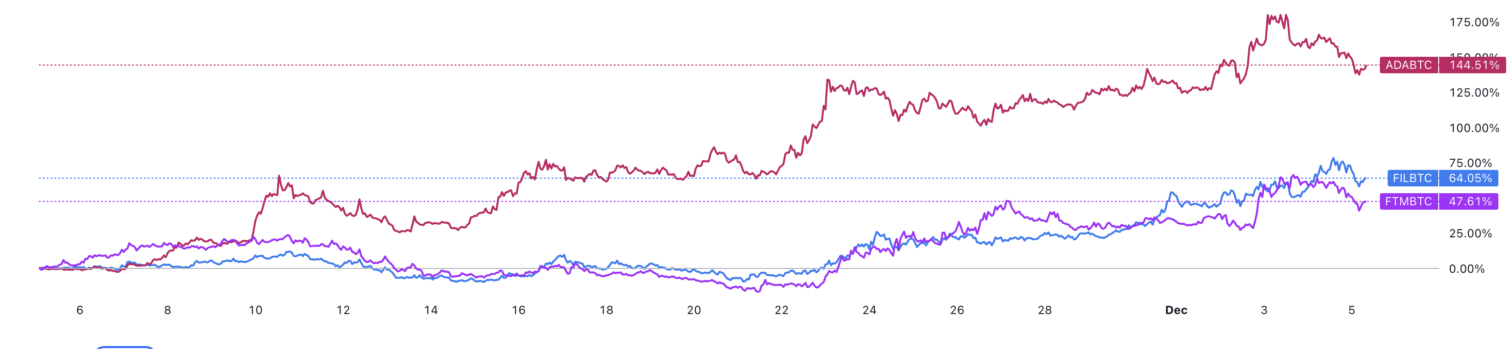 興味深いことに、ファントム(FTM)、カルダノ(ADA)、ファイルコイン(FIL)などのトークンのパフォーマンスを見ると、その予測がすでに実現していることがわかる。以下に示すように、FTMはBTCに対して47%上昇し、FILは64%上昇し、ADAは144%上回っている、過去30日間で。