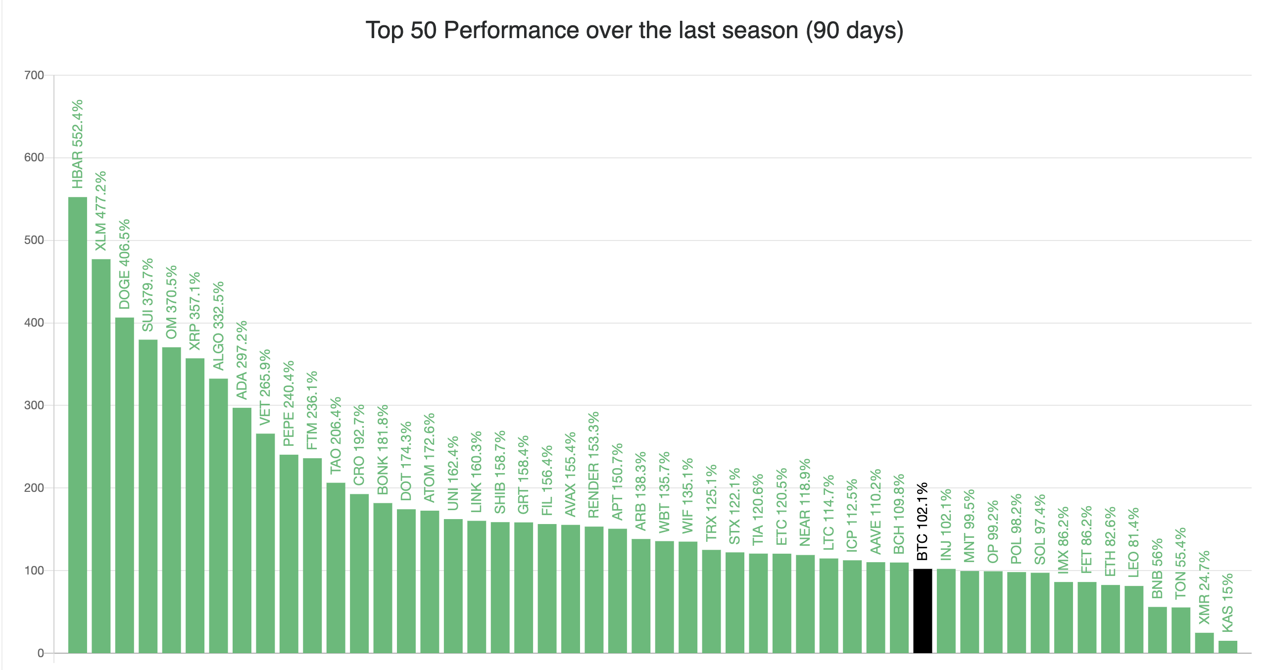 さらに、アルトコインシーズンインデックスもアルトコインの復活を支持している。このインデックスは、ビットコイン(BTC)に対するトップ50の暗号資産のパフォーマンスを90日間のウィンドウで評価する。アルトコインシーズンは、これらの資産の少なくとも75%がBTCを上回ったときに確認される。