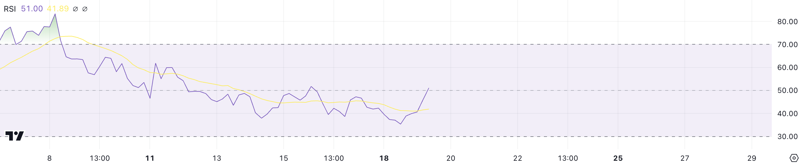 GRASSの相対力指数(RSI)は、約35の低水準から51まで上昇した。この変化は、売られ過ぎの領域からよりバランスの取れた状態への運動量の回復を示している。RSIは重要な運動量指標であり、価格動向の強さと速度を測定し、資産が買われ過ぎか売られ過ぎかを示す洞察を提供する。
