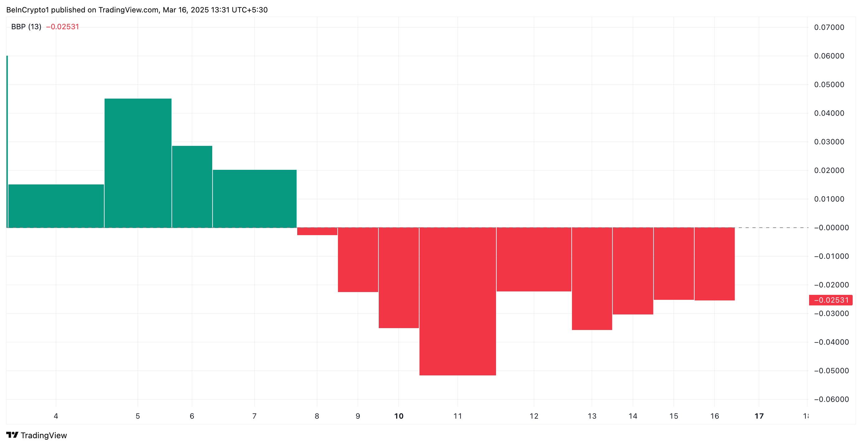 指数が負の場合、売り手が支配しており、価格を下げ、弱気のトレンドを示している。HBARの一貫した負のエルダー・レイ指数は、持続的な下落圧力を示しており、短期的な価格回復の可能性を低くしている。
