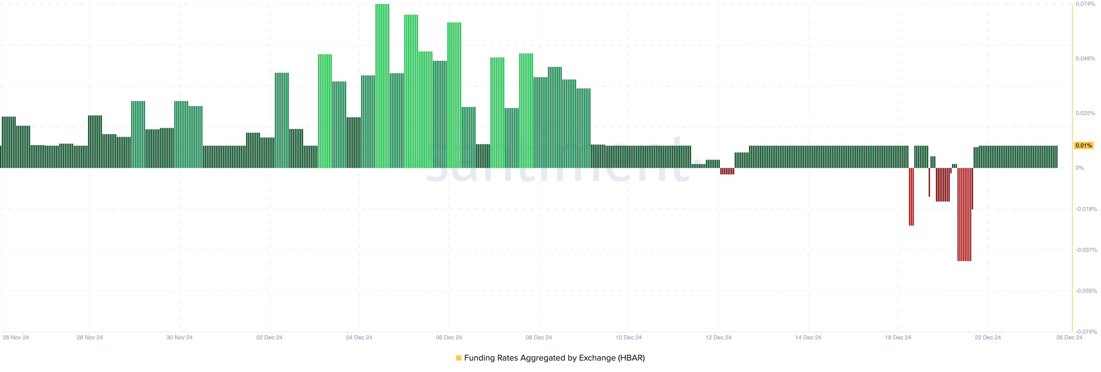 Santimentによると、ヘデラの資金調達率は0.01%のプラス領域にある。これが持続すれば、支配的なロングポジションが短期的にHBARの価格を押し上げる可能性がある。