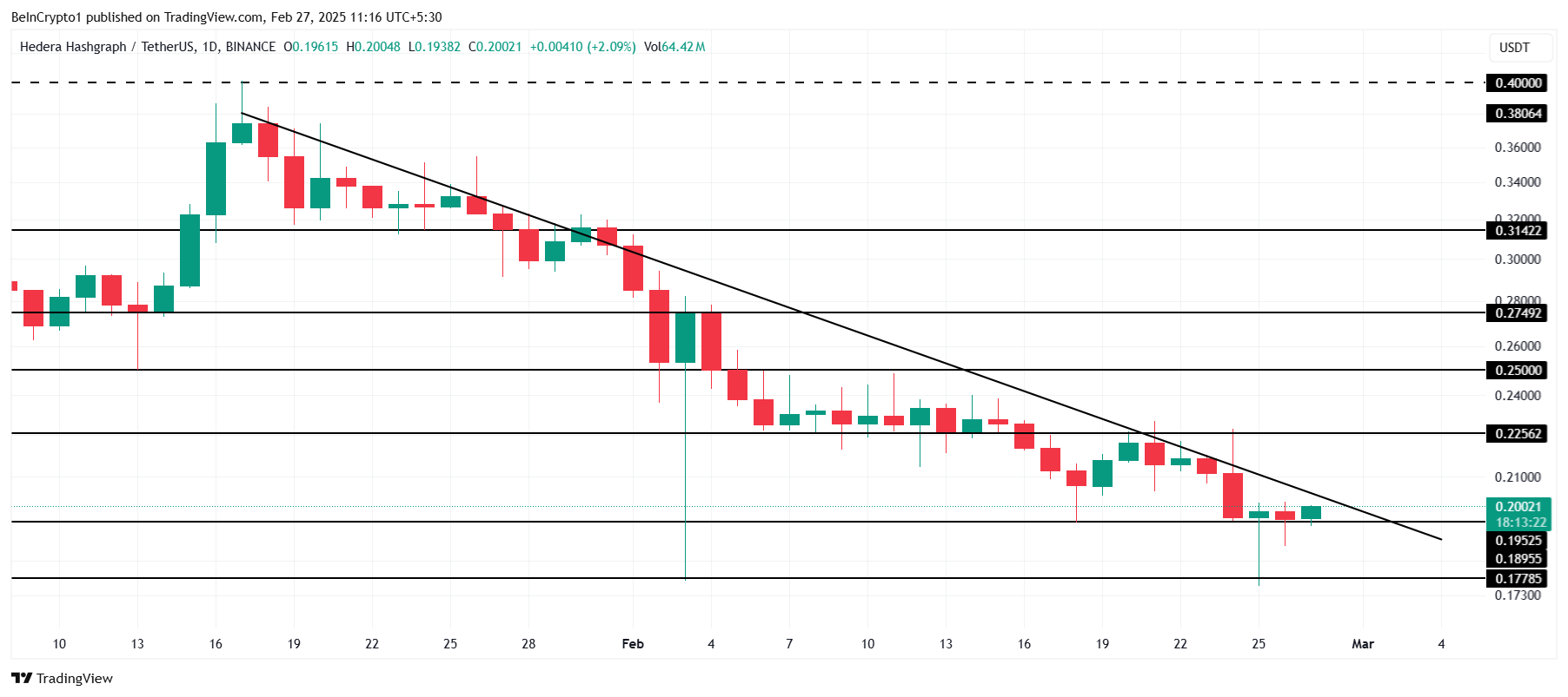 HBARは1月中旬から持続的な下落傾向に直面しており、同アルトコインは市場のネガティブな圧力から回復できていない。