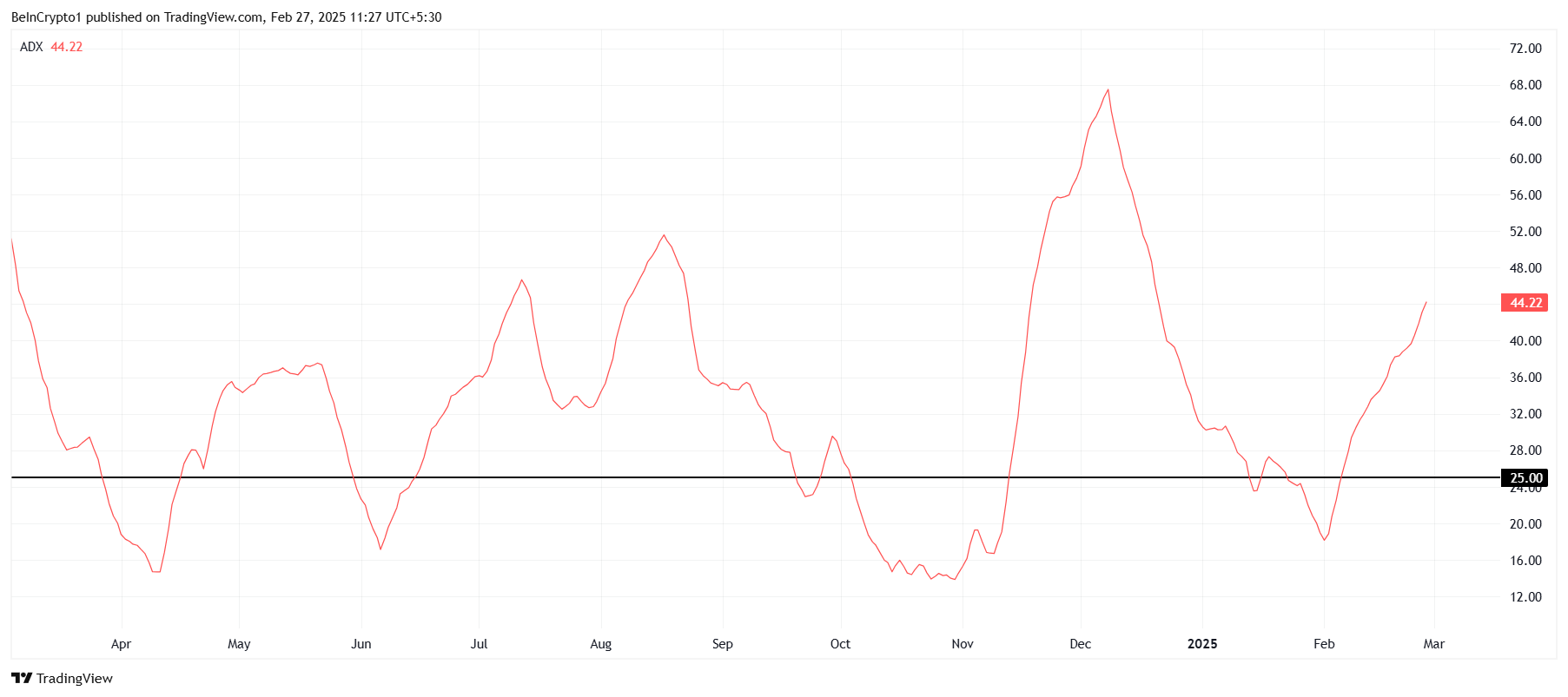 Sponsoredさらに、市場のセンチメントはHBARに対して弱いままだ。進行中の下落傾向は、価格が重要なサポートレベルを上回るのに苦労しているため、投資家の強い回復への信頼の欠如を反映している。ADX指標の上昇は、下落傾向が続く可能性があるという懸念のシグナルであり、アルトコインの潜在的な回復を制限している。