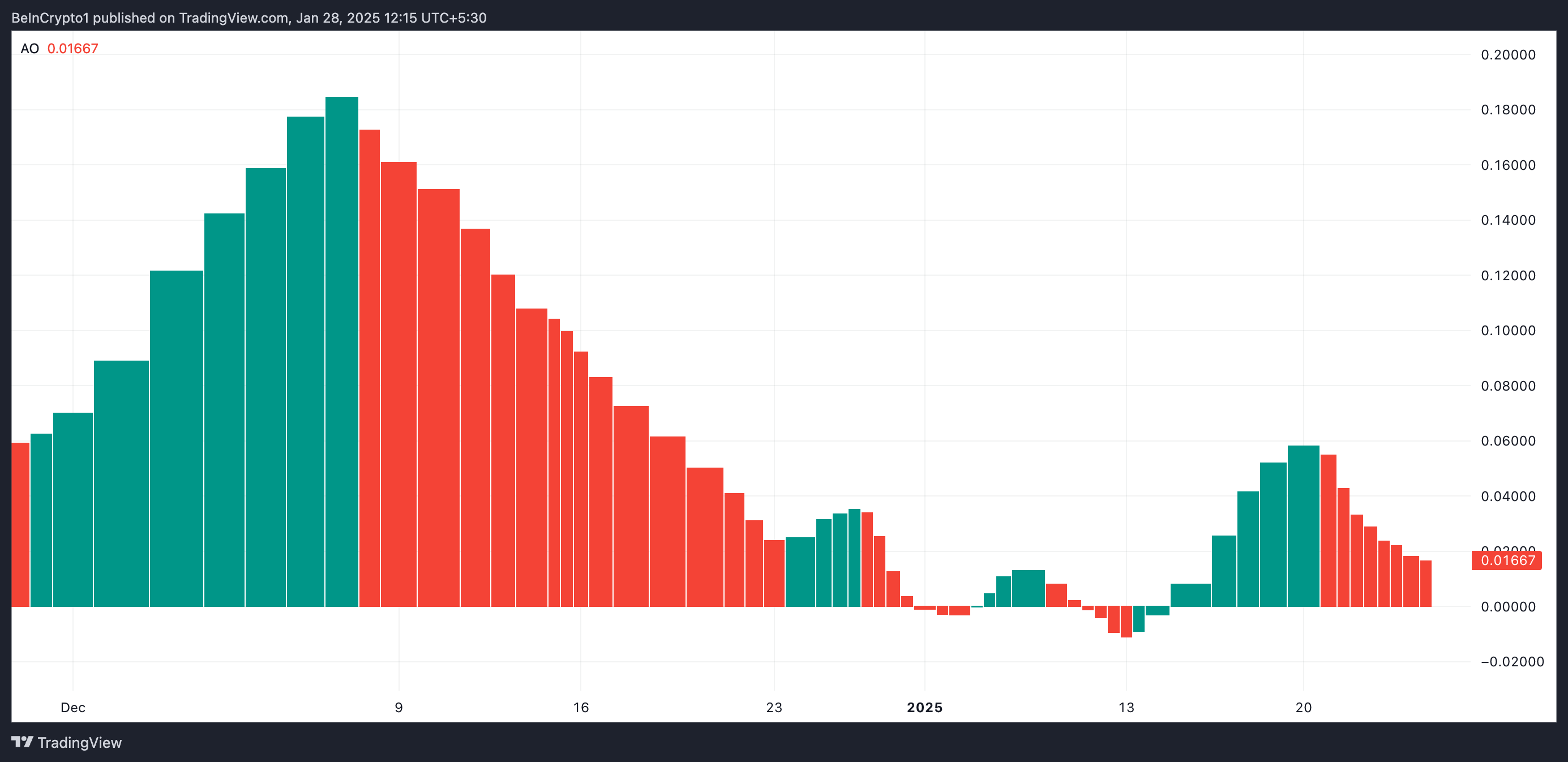 Sponsoredしかし、新たな流入と価格上昇にもかかわらず、HBARには弱気の感情が重くのしかかっている。市場の勢いを測るオーサムオシレーター(AO)は、赤いヒストグラムバーのみを示し続けている。
