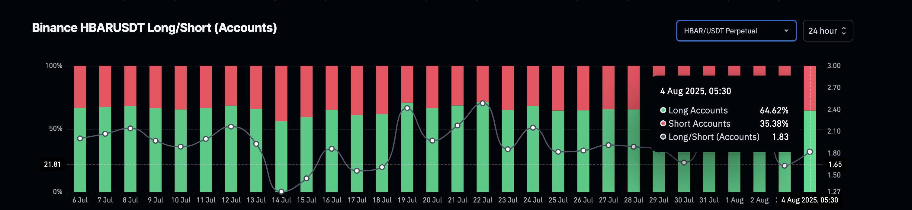 これを支持するのが、Binanceのロング・ショートアカウント比率であり、1.83付近に位置している。これは、HBARを取引するアカウントの約3分の2がロングポジションを取っていることを意味する。取引サイズを追跡するロング/ショートボリューム比率とは異なり、この指標は価格上昇を賭けているトレーダーの数を反映している。これらを総合すると、安定した流出と高いロングアカウントの優勢が、市場構造における強気な基調を裏付けている。