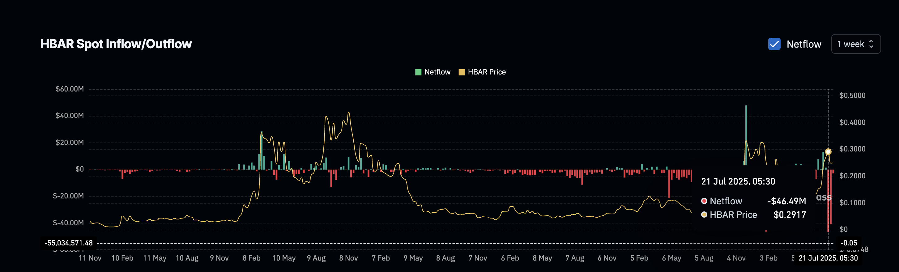 HBARは2週連続で強いマイナスのネットフローを記録している:–4649万ドルと–4085万ドル。これは、トークンが取引所から引き出されている明確なトレンドを示しており、通常は強気なサインであり、投資家の信頼と即時の売り圧力の減少を反映している。