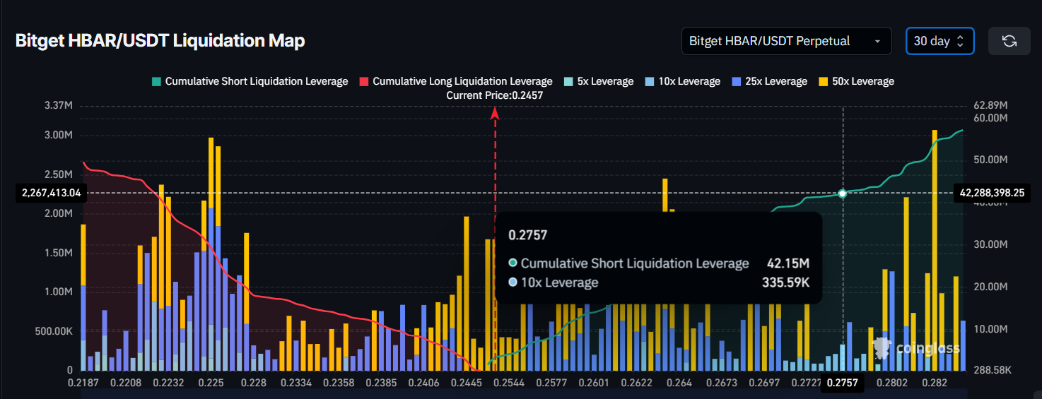 清算マップの最近のデータによれば、HBARが回復し0.276ドルの抵抗レベルに達すれば、約4200万ドル相当のショート契約が清算される可能性がある。この価格ポイントは、HBARの回復にとって重要な障壁となっている。