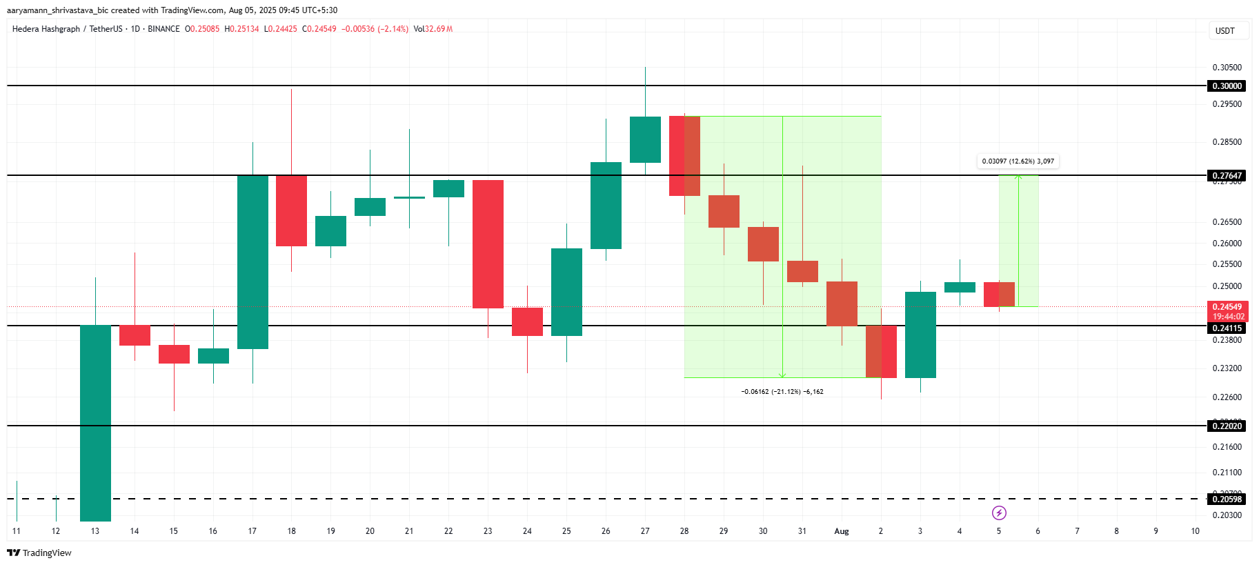 HBARは現在0.245ドルで取引されており、次の主要な抵抗レベルである0.276ドルを12.6%下回っている。この抵抗を突破することが、7月末に被った21%の損失を回復するために不可欠である。