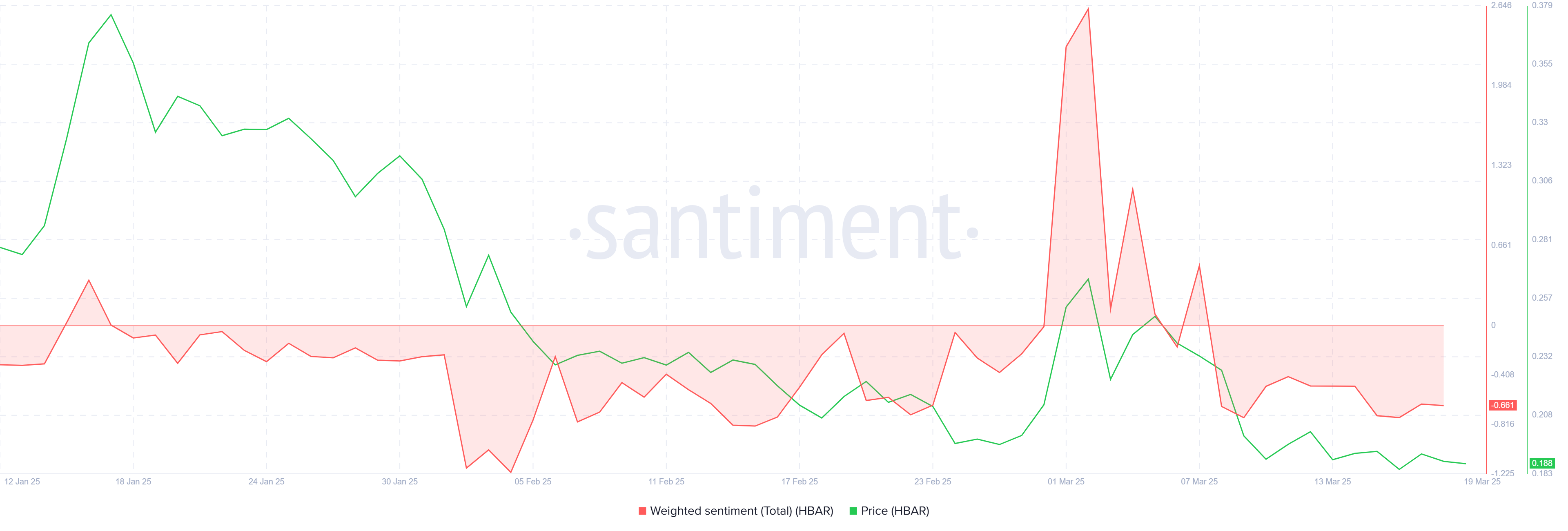 今月のほとんどで投資家のセンチメントはネガティブであった。2月には一時的な上昇活動が見られたが、それはすぐに消え、HBARには大きなサポートが残らなかった。この投資家の確信の欠如は懸念されるものであり、さらなる上昇が持続するのは難しいことを示唆している。