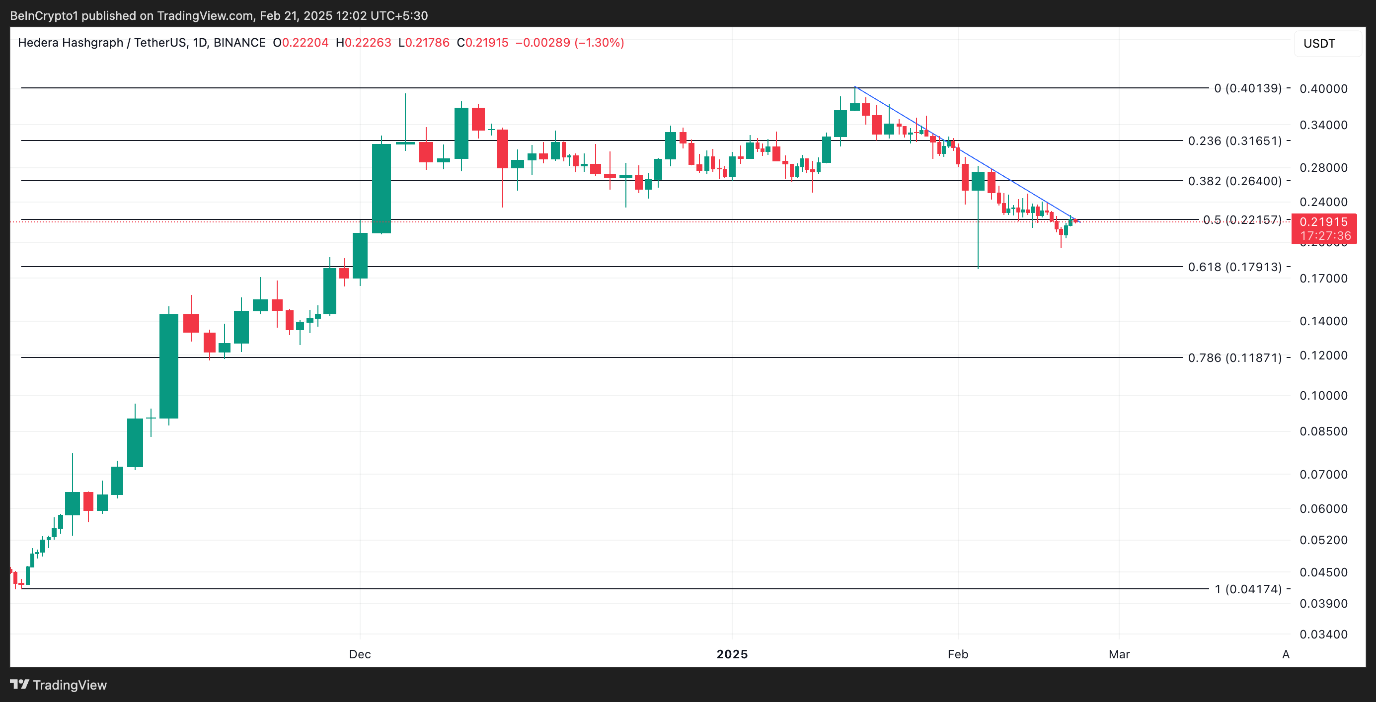 BeInCryptoのHBARのパフォーマンスに関する評価によれば、1月17日に4年ぶりの高値0.40ドルに達して以来、下降トレンドラインの下で推移しており、価格の下落を確認している。本稿執筆時点で0.21ドルで取引されており、トークンの価値は48%下落している。