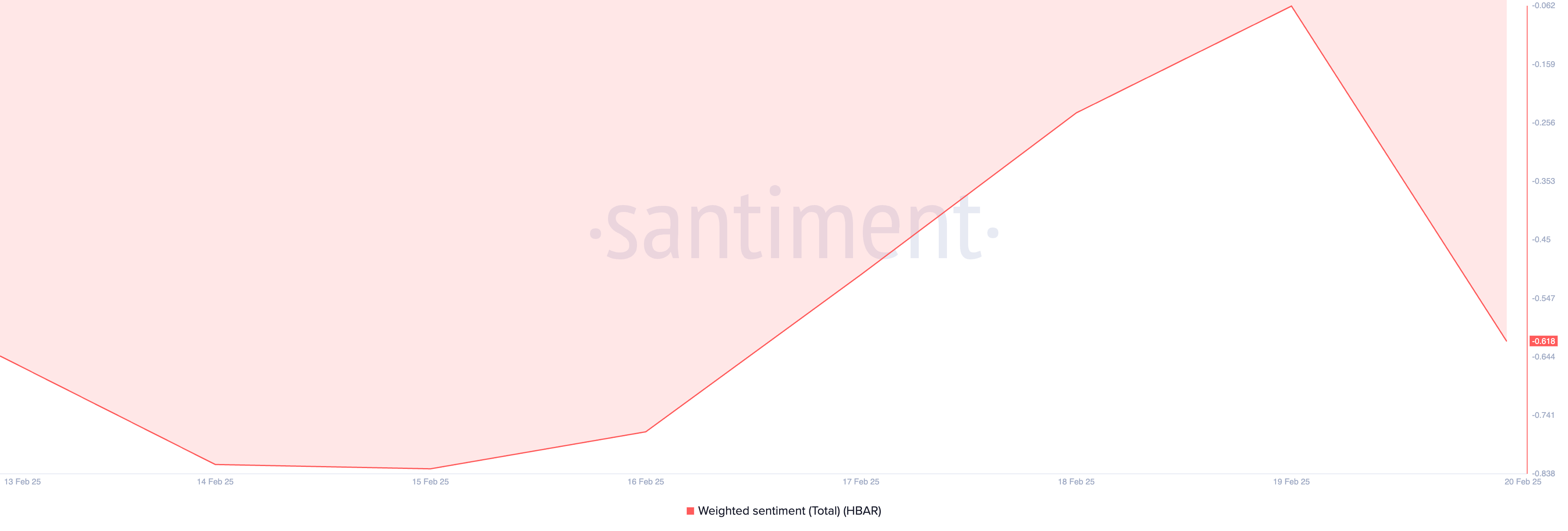 特に、トークンのネガティブな加重感情は、この弱気の市場感情を確認している。Santimentによれば、SNSやオンラインプラットフォームを分析して暗号資産に関する全体的なトーン(ポジティブまたはネガティブ)を測定するオンチェーン指標は、今週ずっとネガティブな値を示している。これは、HBAR保有者がその将来のパフォーマンスに対して楽観的でないことを反映している。