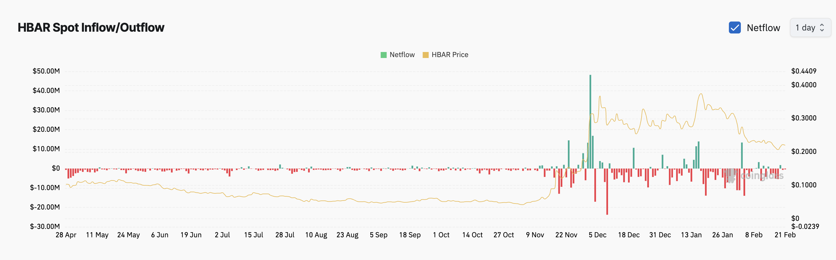 過去1週間、HBARスポット市場からの流出が顕著であり、投資家は過去7日間で1700万ドル以上を引き出した。Coinglassのデータによれば、この期間中にアルトコインは1回の流入しかなく、1月19日に178万ドルが記録された。