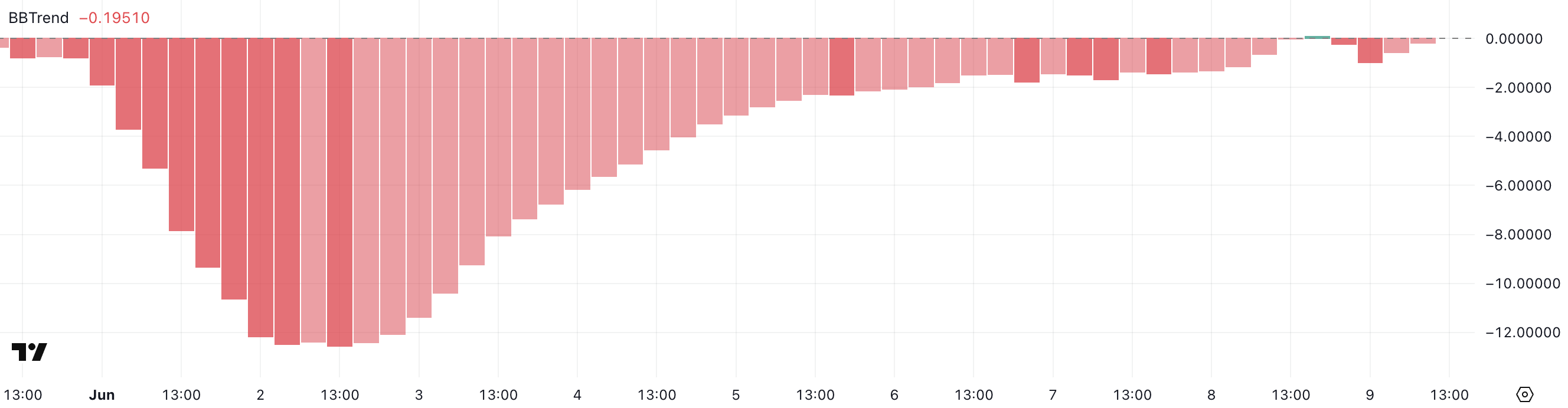 ポジティブなBBTrendは強気なモメンタムを示し、ネガティブな読みは持続的な売り圧力またはボリンジャーバンドの下部範囲内での横ばいの動きを示す。