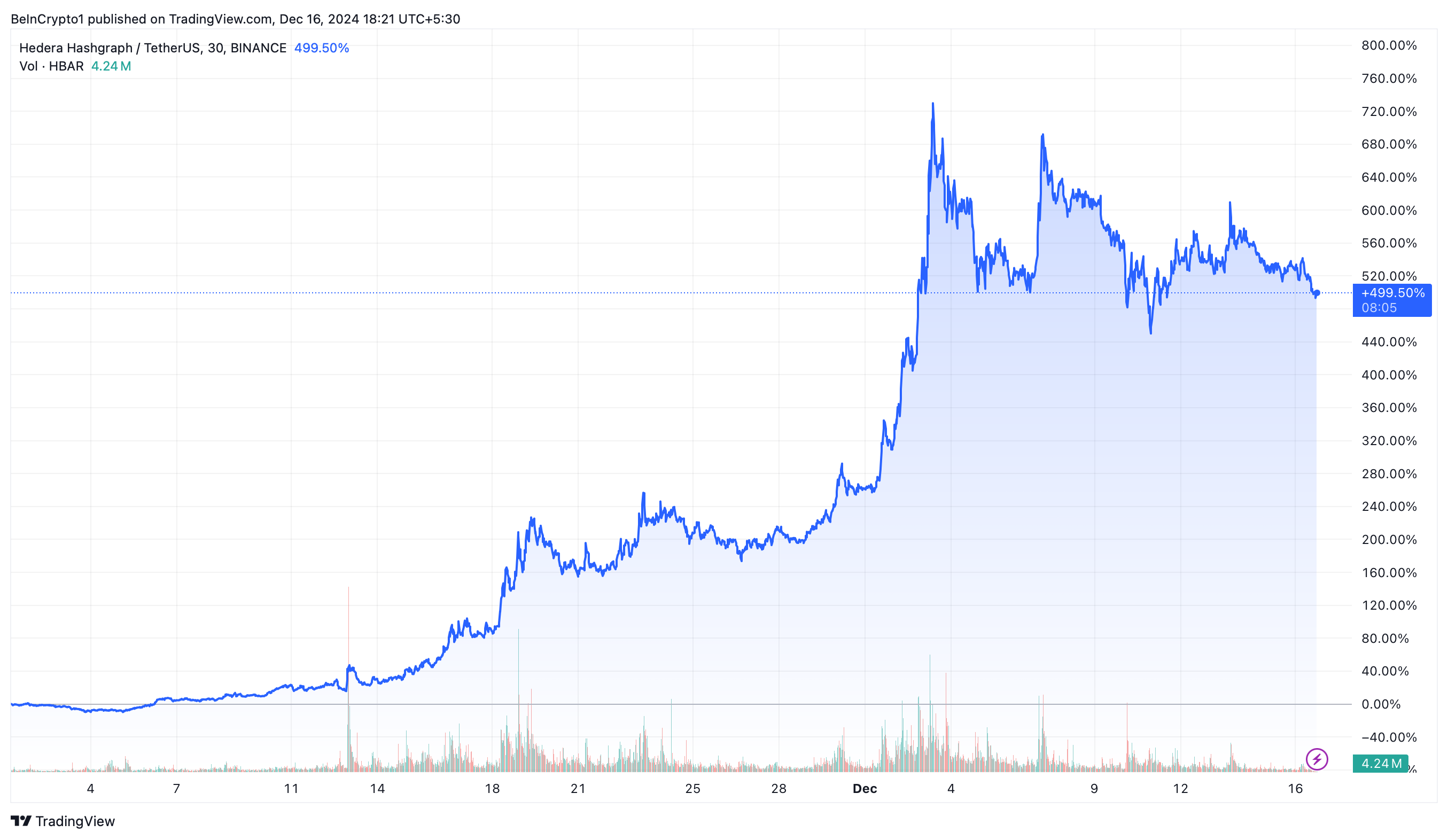ヘデラのエコシステムの急速な進展は、ネイティブトークンHBARの上昇傾向と一致している。11月以来、HBARの市場価値は約500%急騰した。