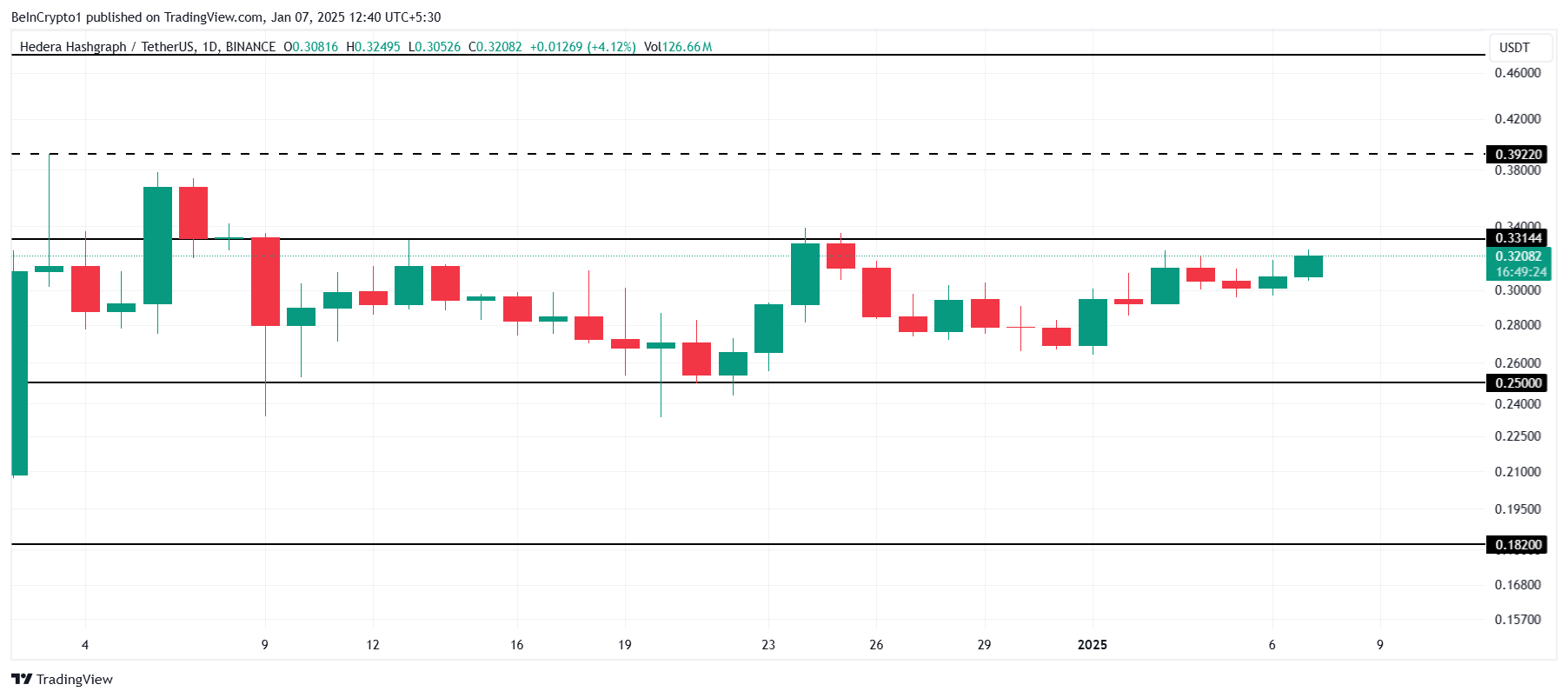 しかし、前述の市場の兆候は、ブレイクアウトが差し迫っていることを示唆しています。成功すれば、HBARは0.39ドルに上昇し、2024年の高値に匹敵し、0.40ドルに達する可能性があります。