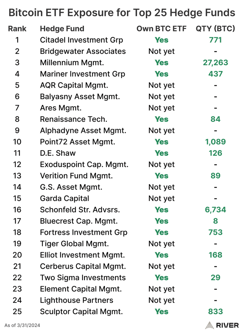 Sponsoredこの傾向を裏付けるように、暗号資産仲介会社リバーのアナリスト、サム・ベイカーは、米国の上位25のヘッジファンドのうち52%がこの投資商品に乗り出していることを強調している。これらのヘッジファンド投資は、Millenium Managementの27,263BTCという大幅な保有からBluecrest Capital Managementの8BTCという控えめな配分まで、幅広いスペクトルを示している。