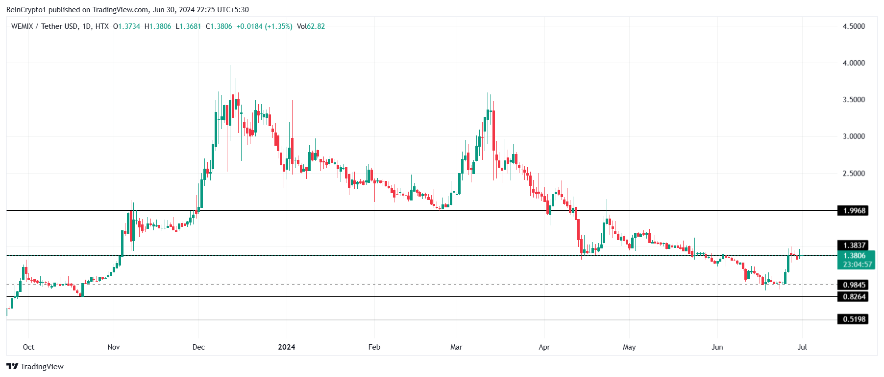 Wemixの価格は過去1ヶ月間、わずか7%の上昇と印象的な動きを見せなかったが、強気の機会を提示している。先週だけで、このアルトコインは35%以上上昇し、1.38ドルで取引されている。