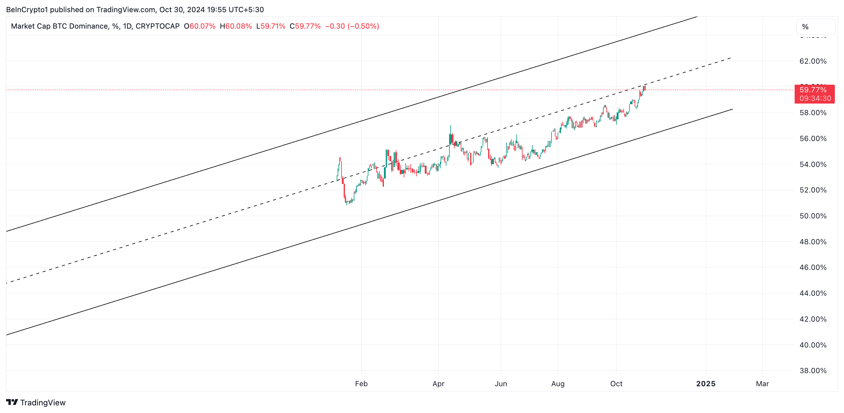 ビットコインの支配力はBTC.Dによって測定され、2021年以来の最高水準に上昇しました。この急増は、ビットコインETFへの大規模な資金流入と多くのアルトコインの相対的な停滞したパフォーマンスと一致しています。