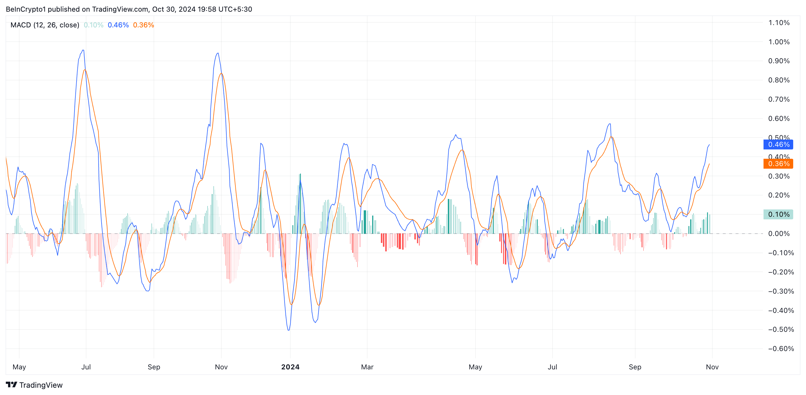 BTC.Dの移動平均収束/発散(MACD)の読み取りは、現在のMACD(青)がシグナルライン(オレンジ)の上にあることを示しています。