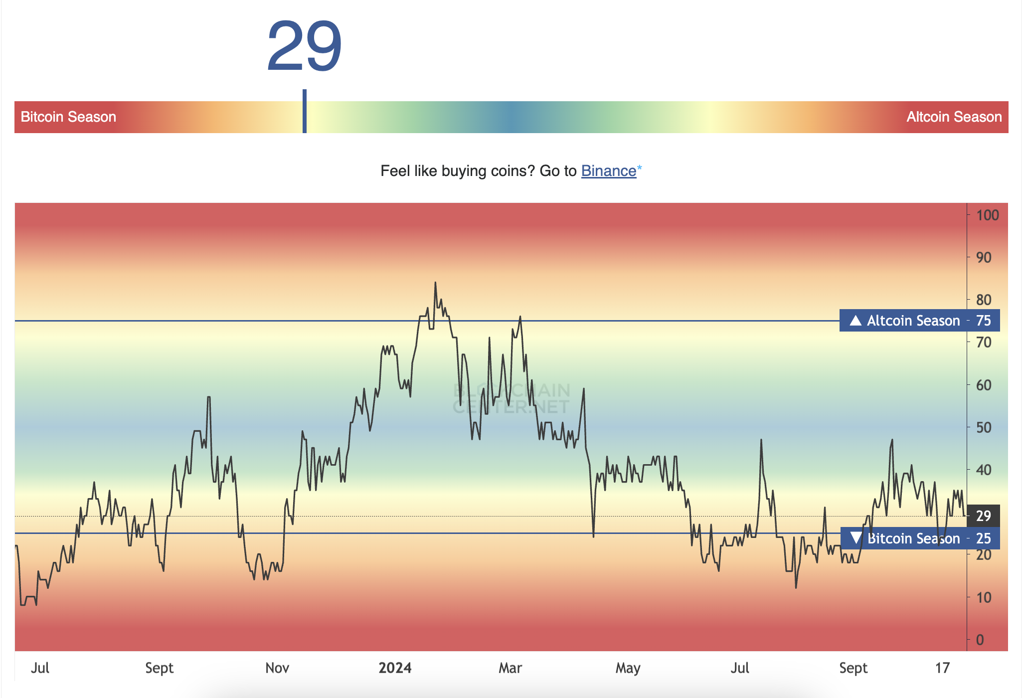 さらに、アルトコインシーズンは、トップ50のアルトコインの少なくとも75%が3か月間でビットコインのパフォーマンスを上回るときに始まります。Blockchain Centerの最近のデータによると、過去90日間でこれらのトップアルトコインの29%のみがビットコインのパフォーマンスを上回っており、アルトコインシーズンを正式に宣言するために必要な75%の閾値を大幅に下回っています。