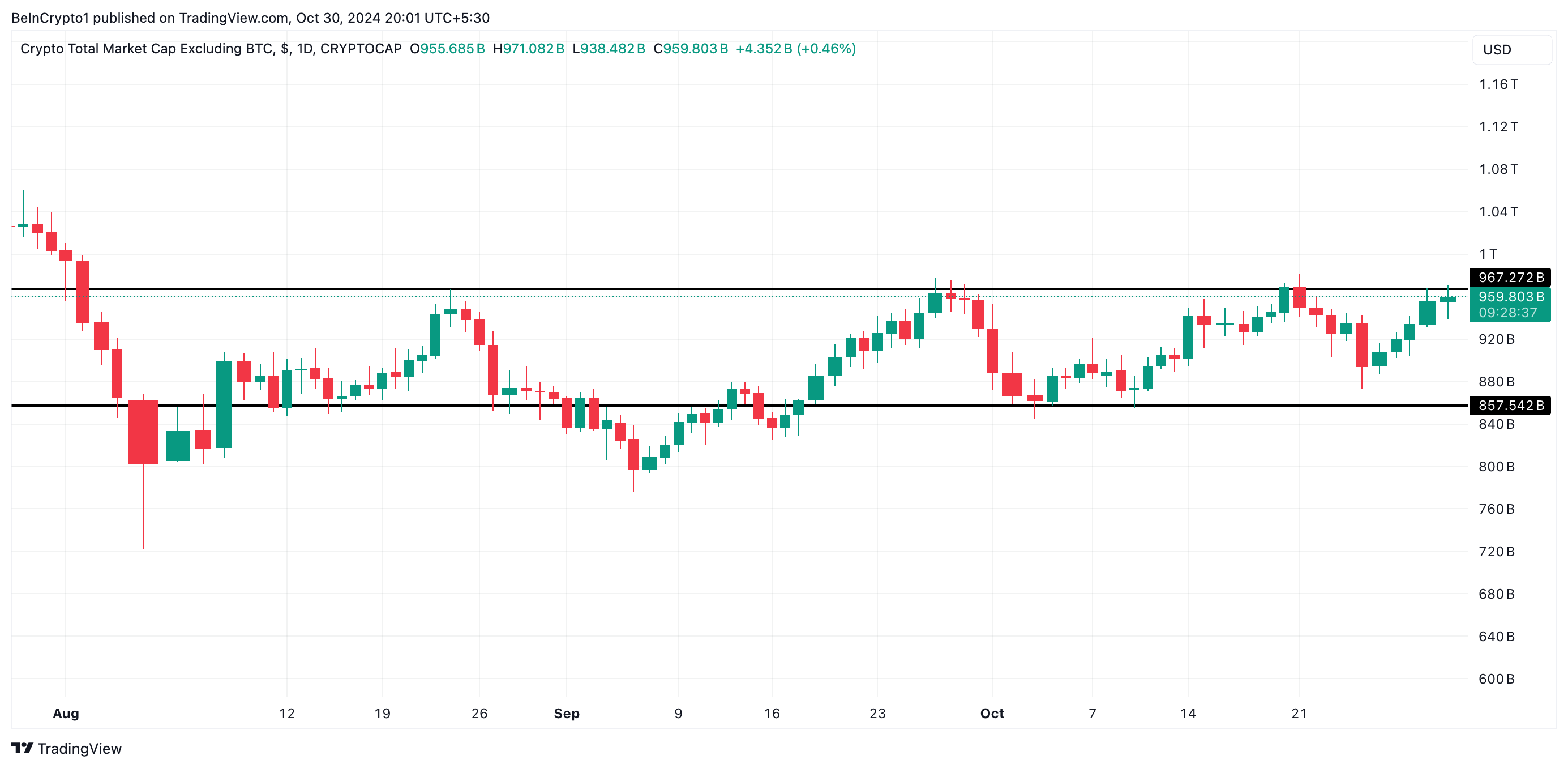 これはTOTAL2(ビットコインを除くすべての暗号資産の総市場資本化)の横ばいの動きとして反映されています。BTC.Dが急上昇する一方で、TOTAL2は9670億ドルと8560億ドルの価格範囲内で固まっています。