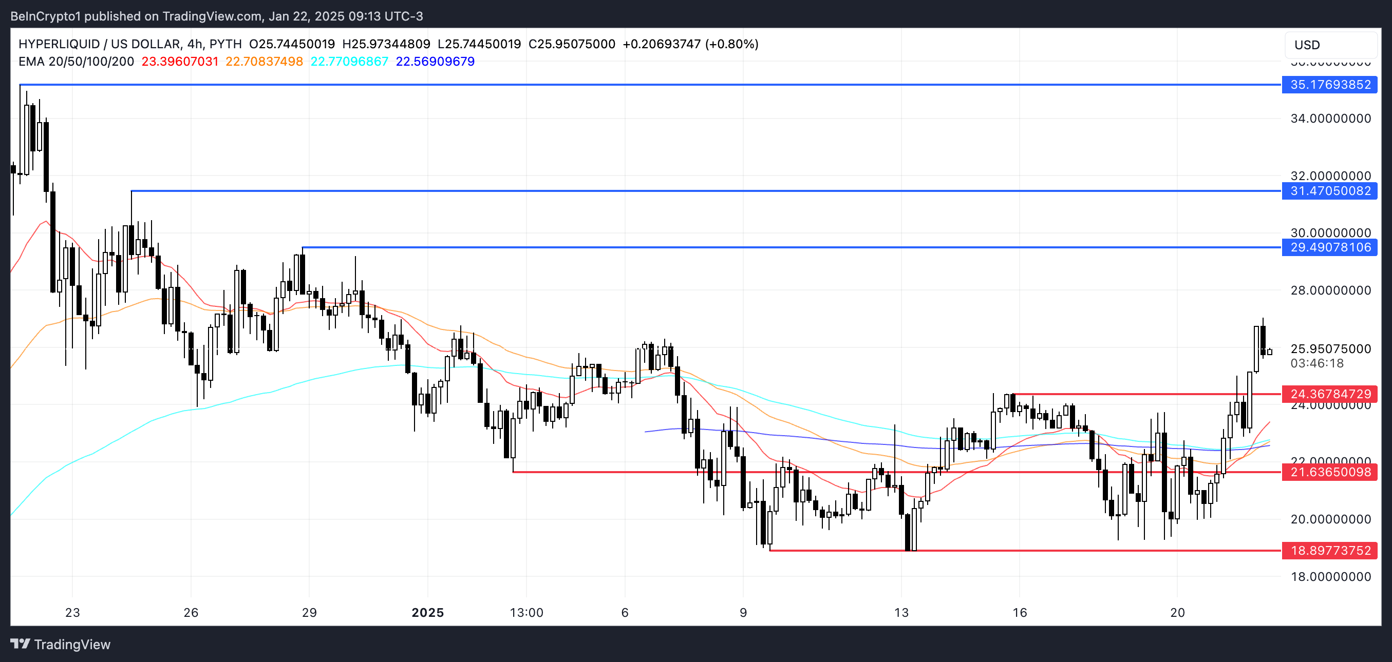 取引量は約40%増加し、3億ドル近くに達しました。HYPEの価格は1月7日以来初めて25ドルを超えました。勢いが増す中、トレーダーはHYPEの次の動きを見極めるために、重要な抵抗とサポートレベルを注視しています。