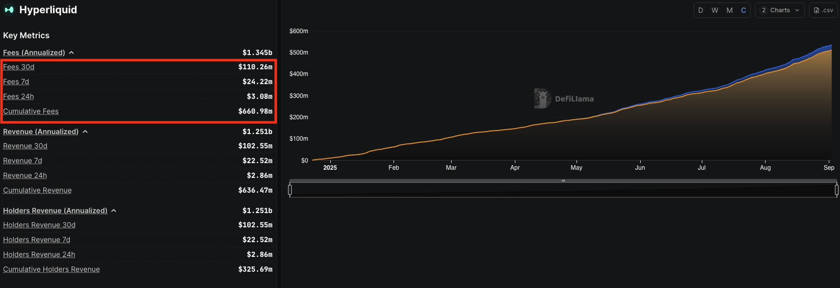 過去30日間で、ハイパーリキッドの収益は1億1000万ドルを超え、累積収益は約6億6100万ドルに達した。これは非カストディアルの永久DEXとしては稀な成長軌道である。DefiLlamaのデータによれば、市場の「スローサマー」にもかかわらず、プロトコルの手数料生成は着実に増加している。