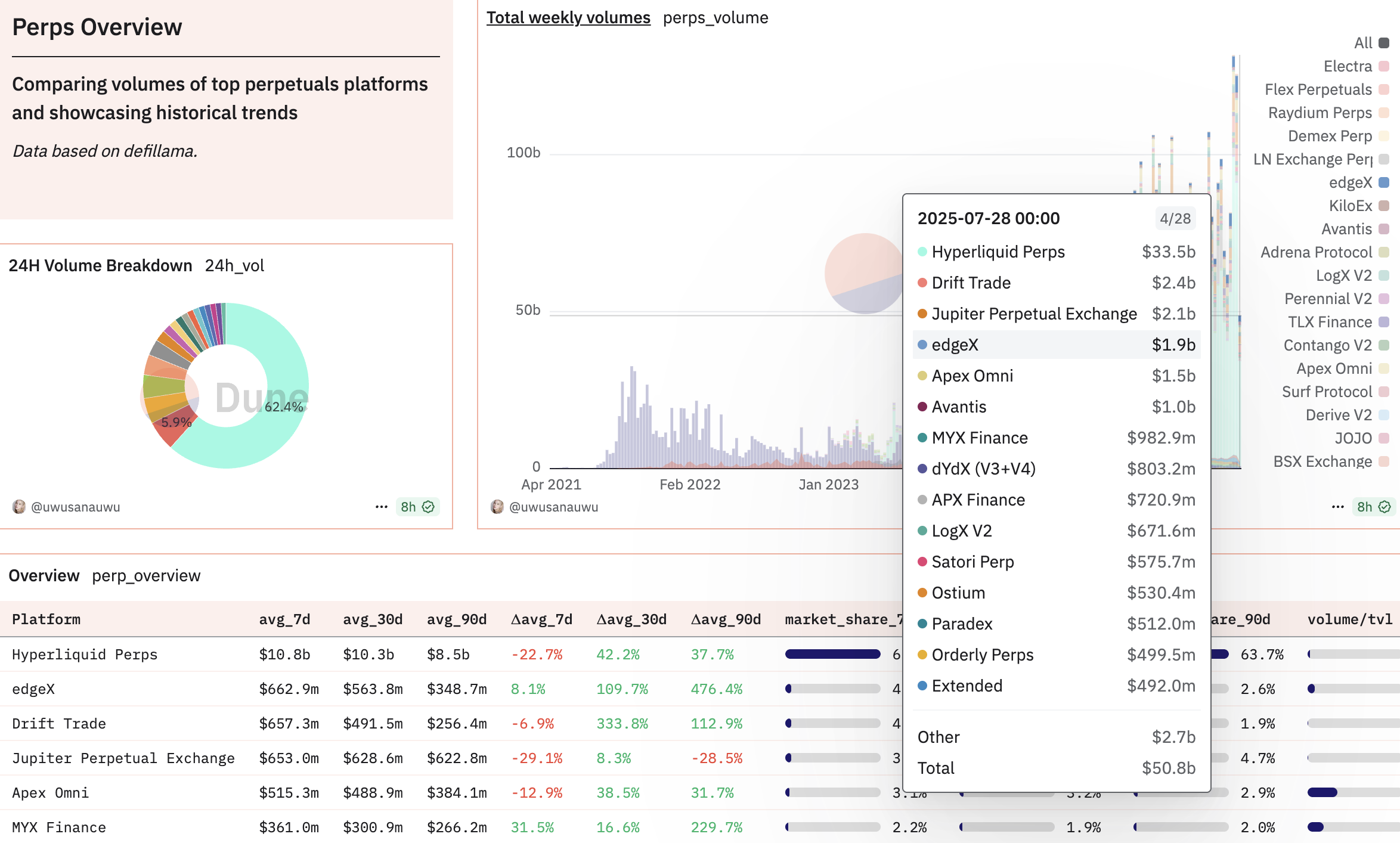 ロビンフッドは5月の1920億ドルから大幅に減少した。ハイパーリキッドは現在、永久先物取引の分野で多くの大手を凌駕している。