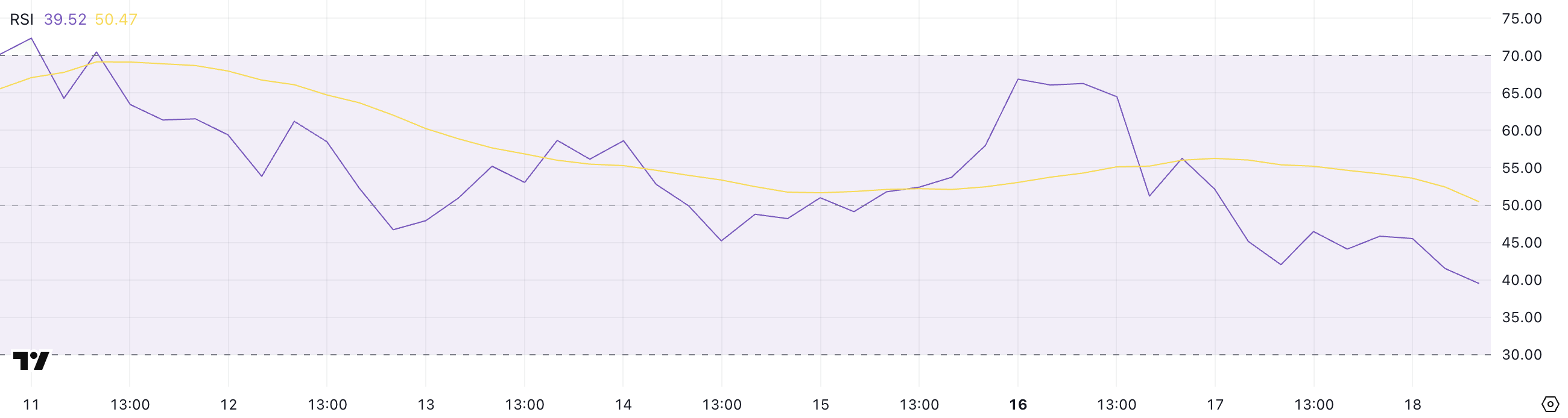 ハイパーリキッドの相対力指数(RSI)は、2日前の56.26から大幅に下落し、39.52となった。