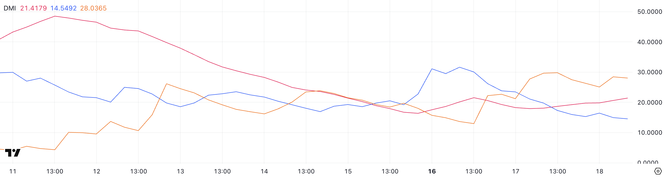 ハイパーリキッドの方向性指数(DMI)は、平均方向性指数(ADX)が前日の17.93から21.41に上昇したことを示している。