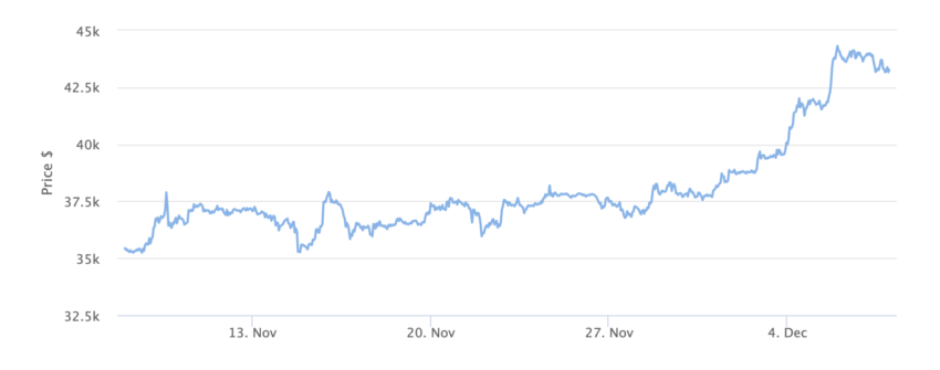 しかし、ビットコインの価格は過去1カ月で急騰している。記事公開時、ビットコインの価格は43,222ドルである。