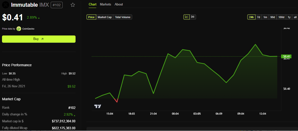 この楽観的な見方にもかかわらず、イミュータブルのネイティブトークンはわずか2.89%の上昇にとどまっている。本稿執筆時点で、IMXは0.41ドルで取引されていた。