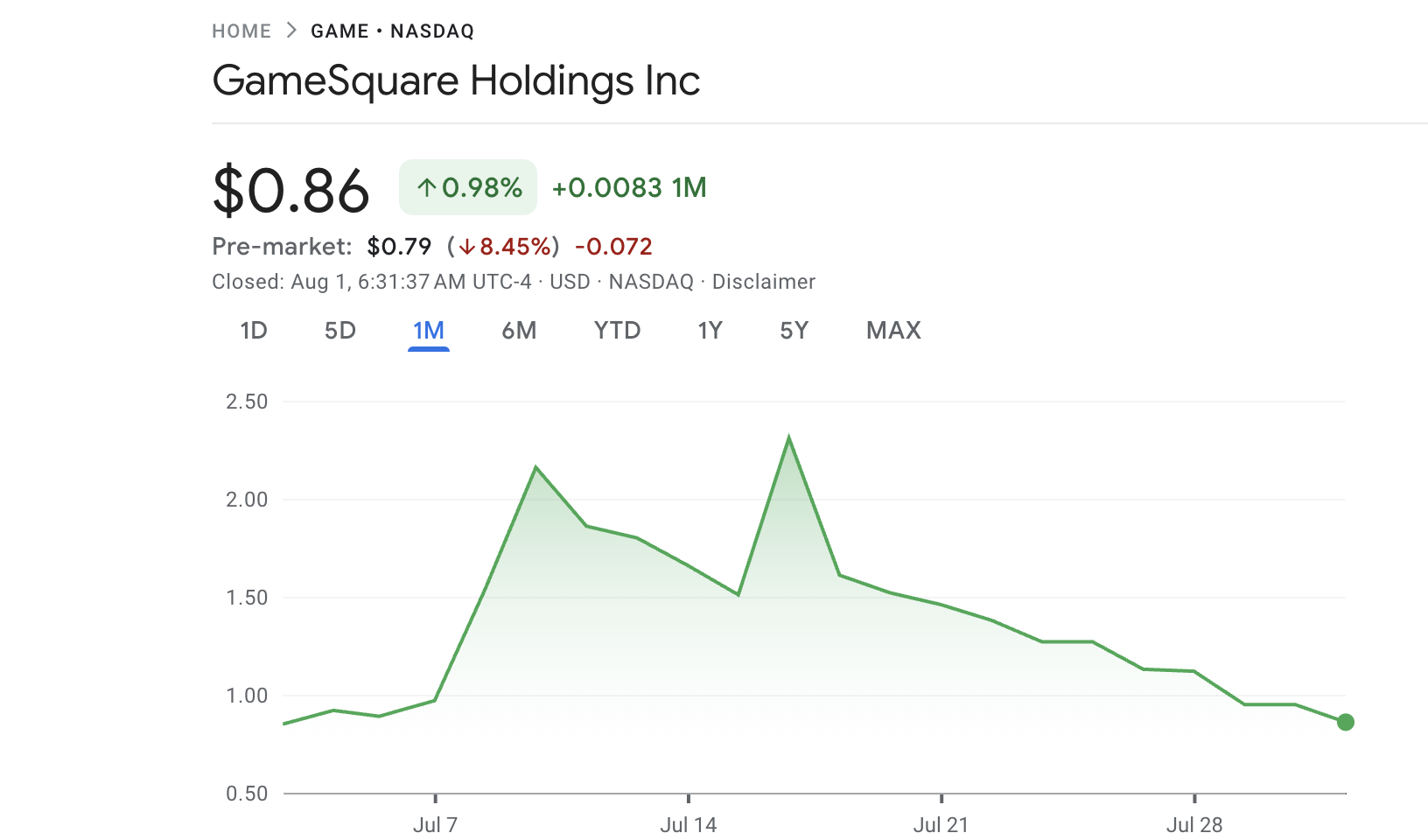 SponsoredGoogle Financeのデータによれば、株価は市場終了時に0.86ドルで、過去1か月で0.98%上昇した。プレマーケット取引では、GAMEはさらに8.45%下落した。