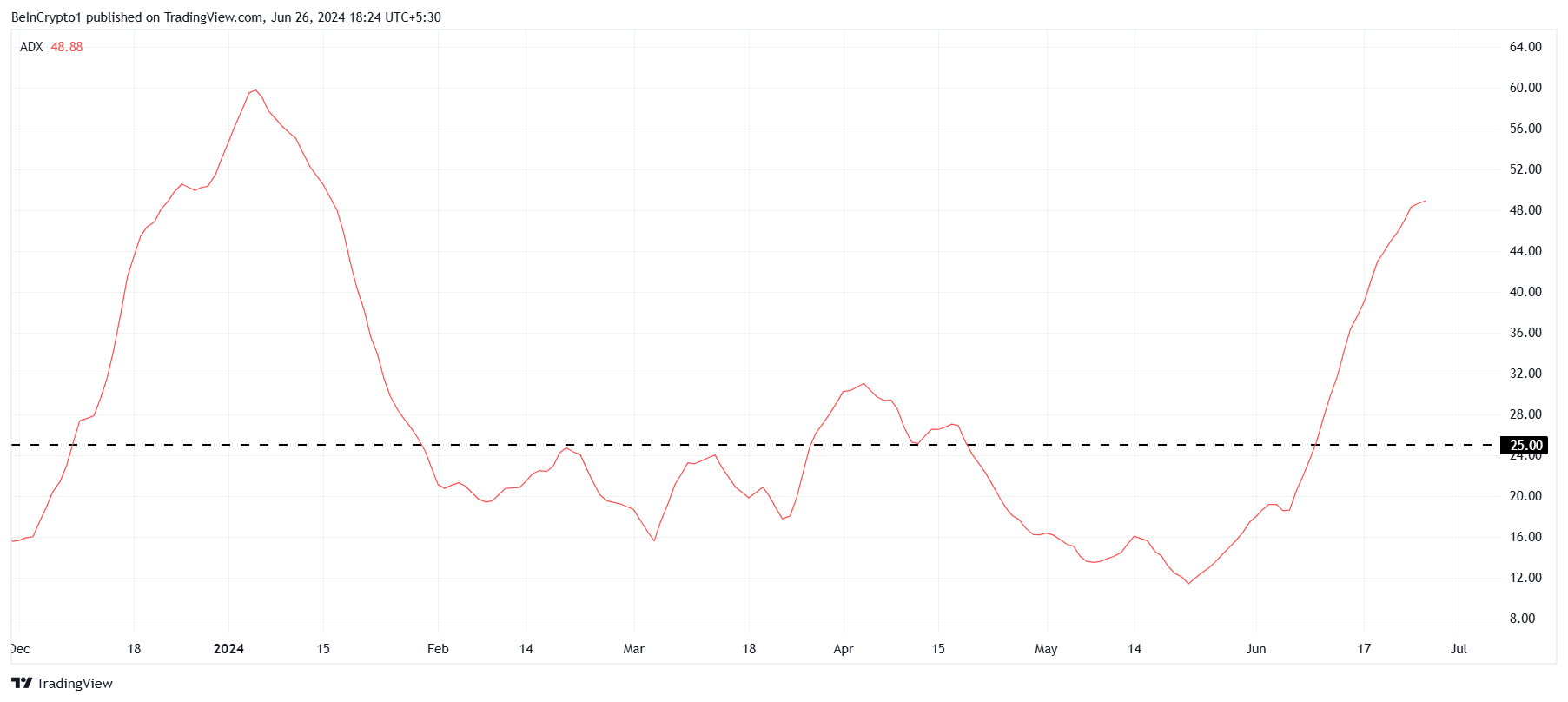 しかし、このMACDシグナルにもかかわらず、ICPは引き続き大きな課題に直面している。これは平均方向性指数 (ADX) に表れており、強い下降トレンドを指している。