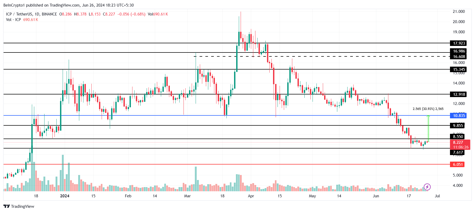 8.2ドルで取引されているICP価格は、7.6ドルのサポートレベルで跳ね返され、8.5ドルを突破しようとしている。この障壁が破られれば、アルトコインはさらに上昇する可能性がある。しかし、堅調な回復ラリーを開始するためには、暗号資産はまず10.8ドルに到達する必要がある。