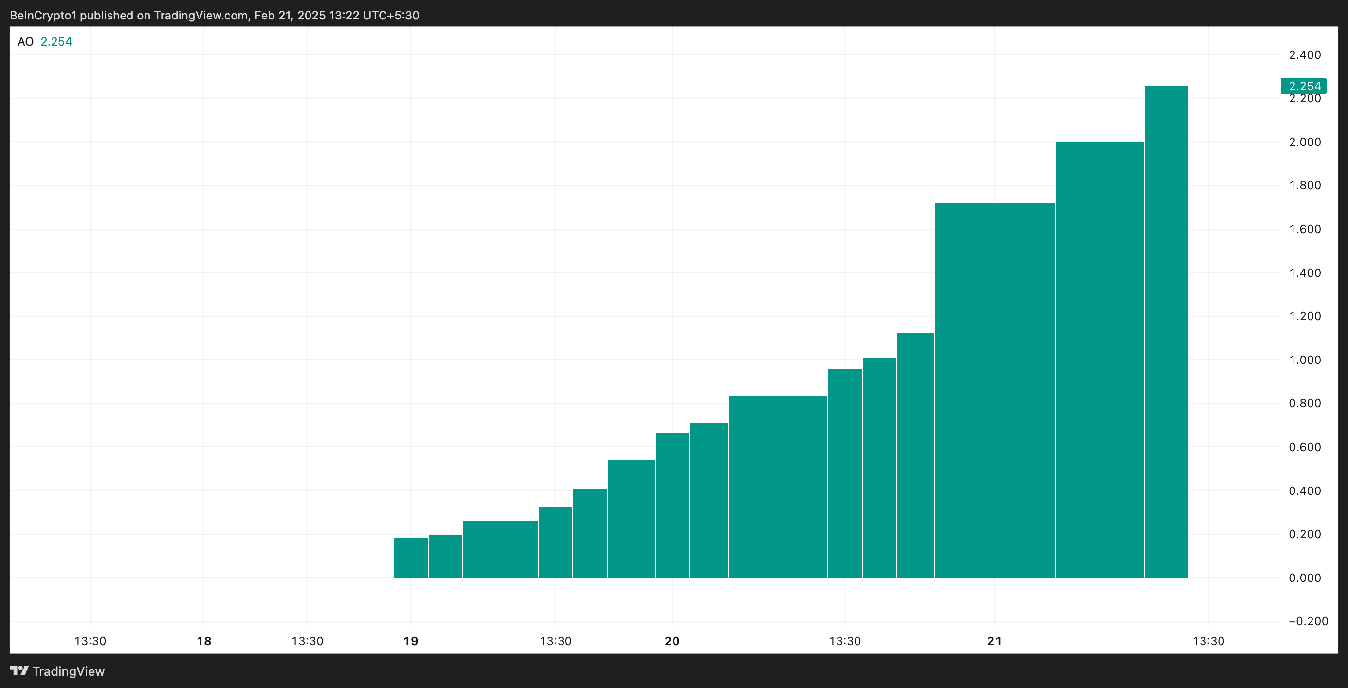 さらに、IPのオーサムオシレーター(AO)の読み取りも、保有者の間での顕著な上昇傾向を確認している。IPのローンチ以来、指標は緑色の上向きのヒストグラムバーのみを示している。