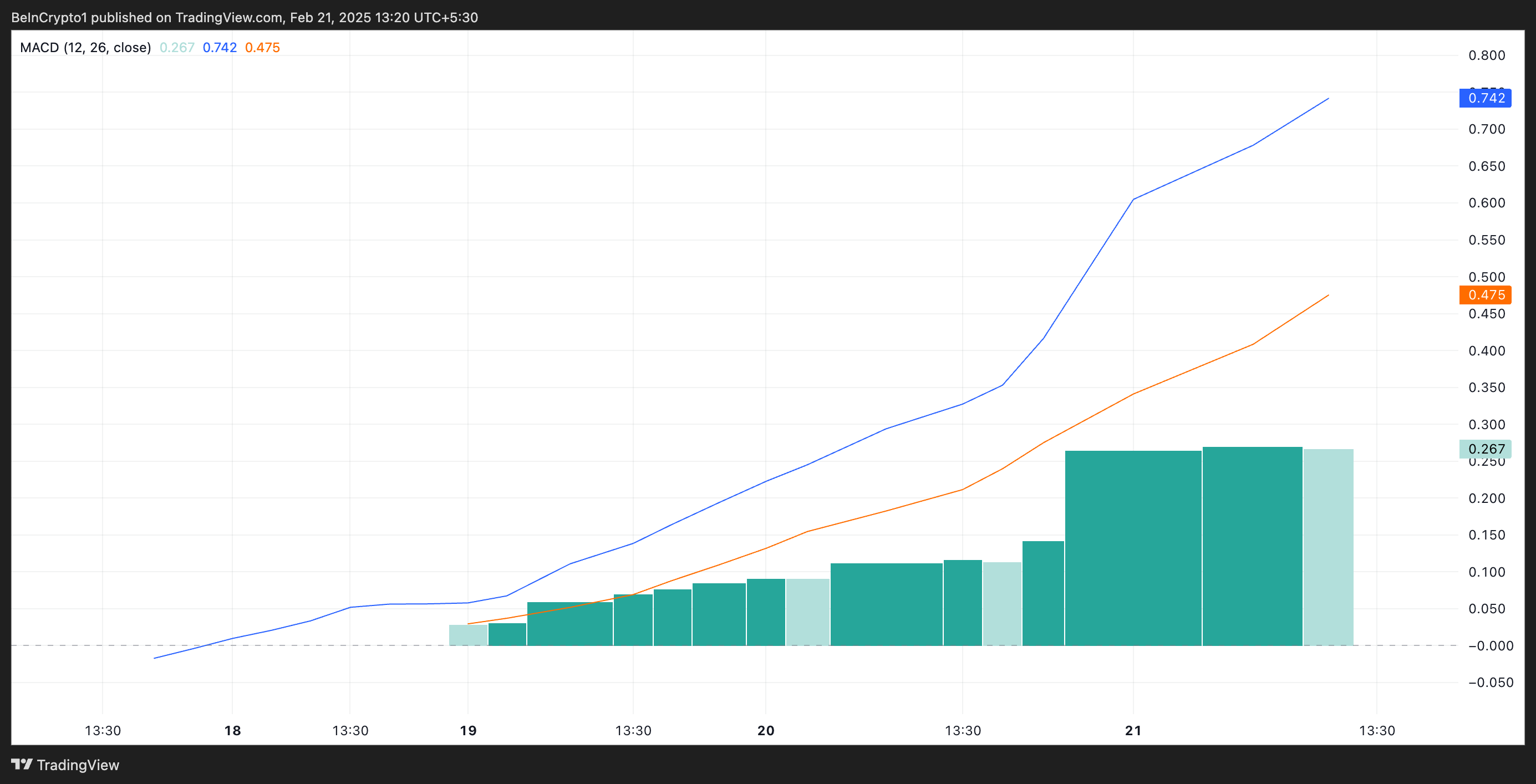 トークンの移動平均収束拡散(MACD)指標の設定は、この上昇傾向を確認している。本稿執筆時点で、IPのMACDライン(青)はシグナルライン(オレンジ)の上に位置している。
