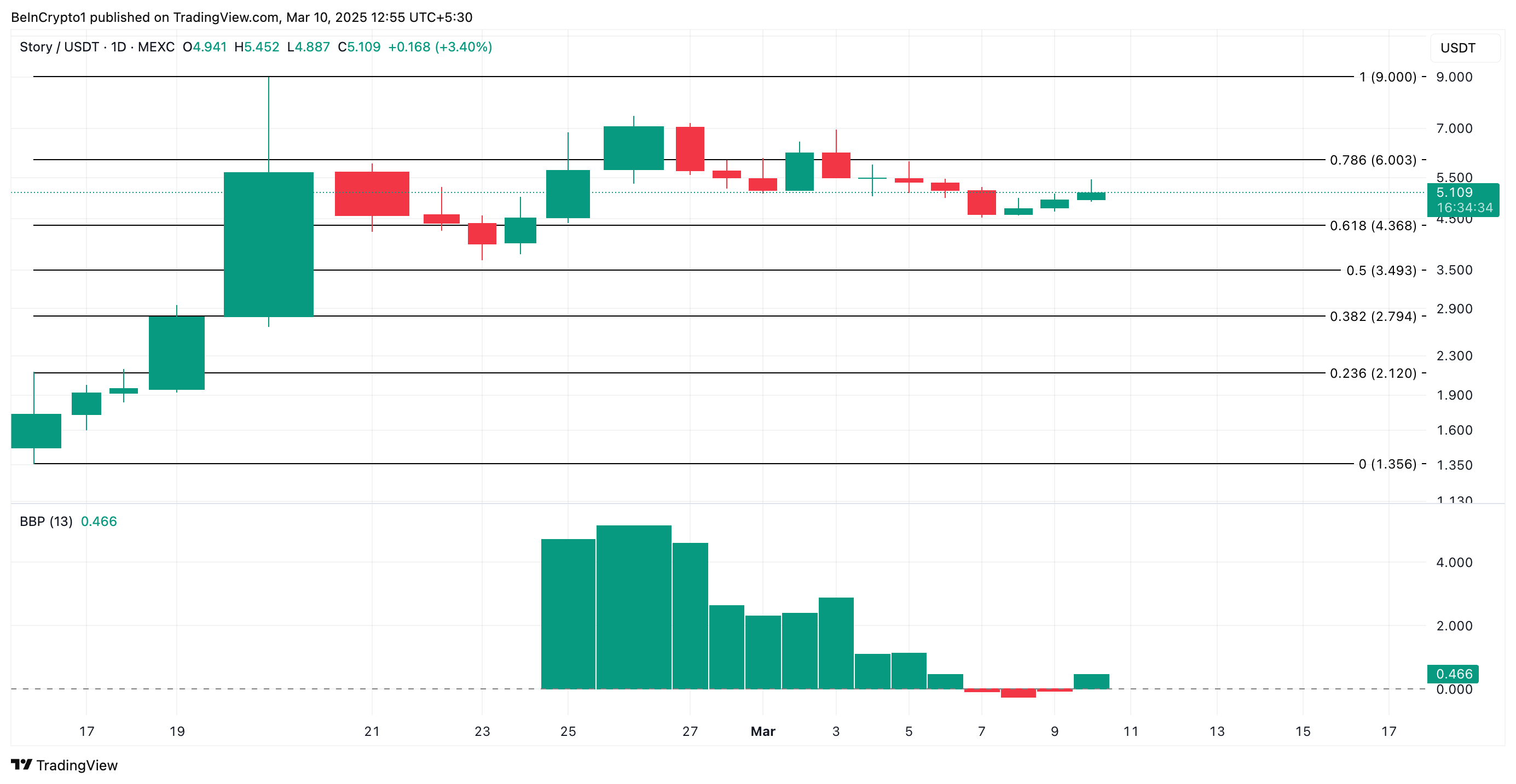 指標の値がプラスである場合、強気派が支配している。トレンドは、IPが現在、弱気の力の値より高い価格で取引されていることを示し、上昇の勢いを示している。この傾向が続けば、トークンの価格は6ドルまで上昇する可能性がある。