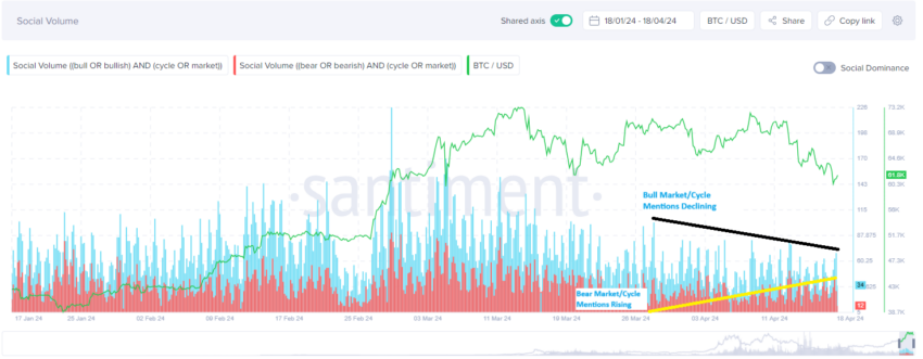 オンチェーンデータプラットフォームSantimentは、市場センチメントの変化を報告している。データによると、3月下旬以降「強気相場/サイクル」の言及が上昇している。さらに、FOMO(買い逃しを恐れる)センチメントが低下し、FUD(恐怖、不確実性、疑念)が上昇している。