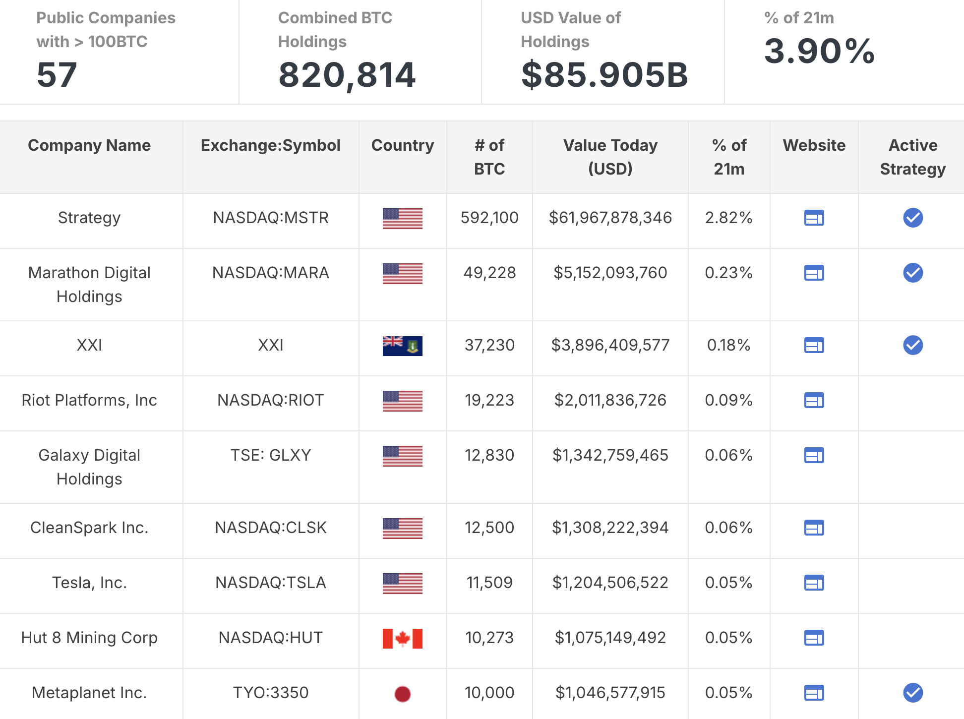 ビットコインマガジンのデータによれば、上場企業のBTC保有量は82万BTCを超え、その価値は850億ドル以上に達している。ストラテジーは依然として主要な名前で、59万2000BTC以上を保有している。