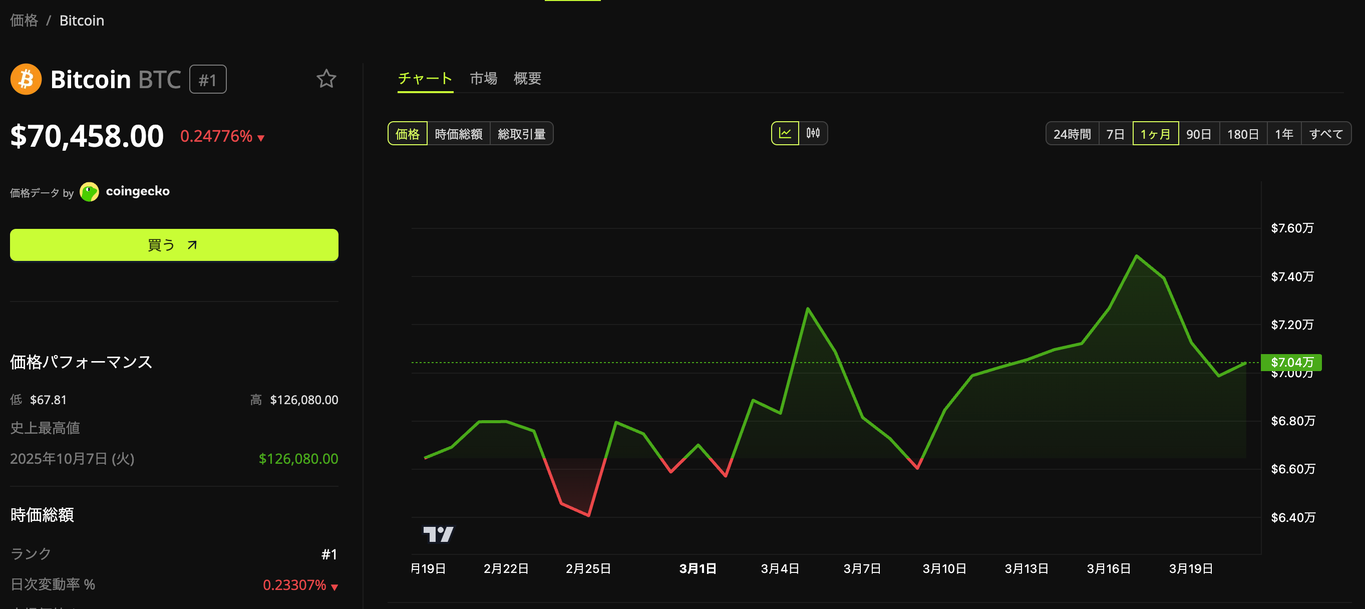 3月20日時点でビットコインは約7万ドル台で推移しており、24時間で約4%下落した。今週初めにはイラン情勢の沈静化期待から一時7万5,000ドル台に上昇し、2月末比で1割以上高い水準を付けていたが、その後は売りが優勢となって水準を切り下げた。