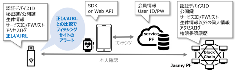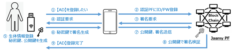 ジャスミーの新認証ソリューションでは、指定したデバイスやスマートフォンアプリ(認証デバイス:AD)とブロックチェーンプラットフォームを結びつけて、IDとパスワード情報を安全に登録し管理。同システムでは、安全なパスワードの自動生成と公開鍵方式による安全な通信が可能だ。生体情報も使用可能で、情報はAD内に保存される。同社はサービス事業者にAD認証用のSDKとAPIを提供し、IDとパスワードの入力なしでアプリケーションにログイン可能に。現在開発中のフィルム型静脈認証モジュールをADに組み込むことで、指をかざすなどの「One Action」でのログインを実現する。