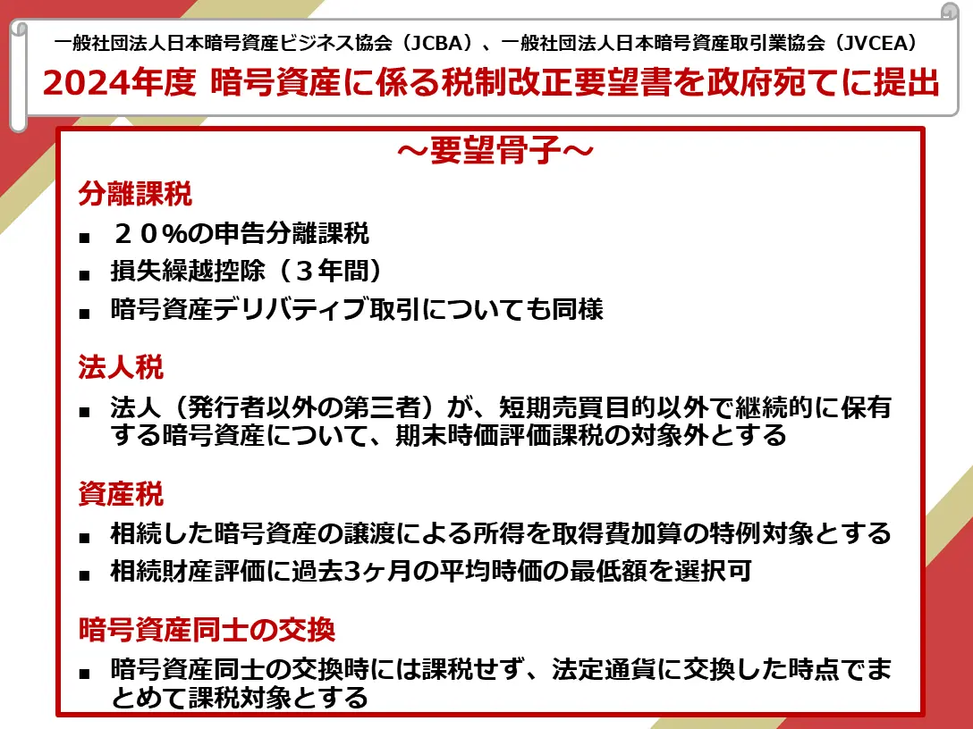 日本暗号資産ビジネス協会は(JCBA)は31日、税制検討部会を中心とし、日本暗号資産取引業協会(JVCEA)とともに、暗号資産に係る2024年度税制改正要望書を取りまとめ、金融庁はじめ政府関係省庁へ提出した。