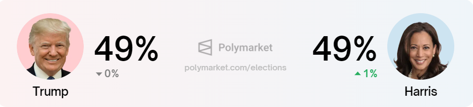 一方、Polymarketのオッズでは、ハリス氏とドナルド・トランプ氏が49%で並んでおり、木曜日の見通しを事実上維持している。